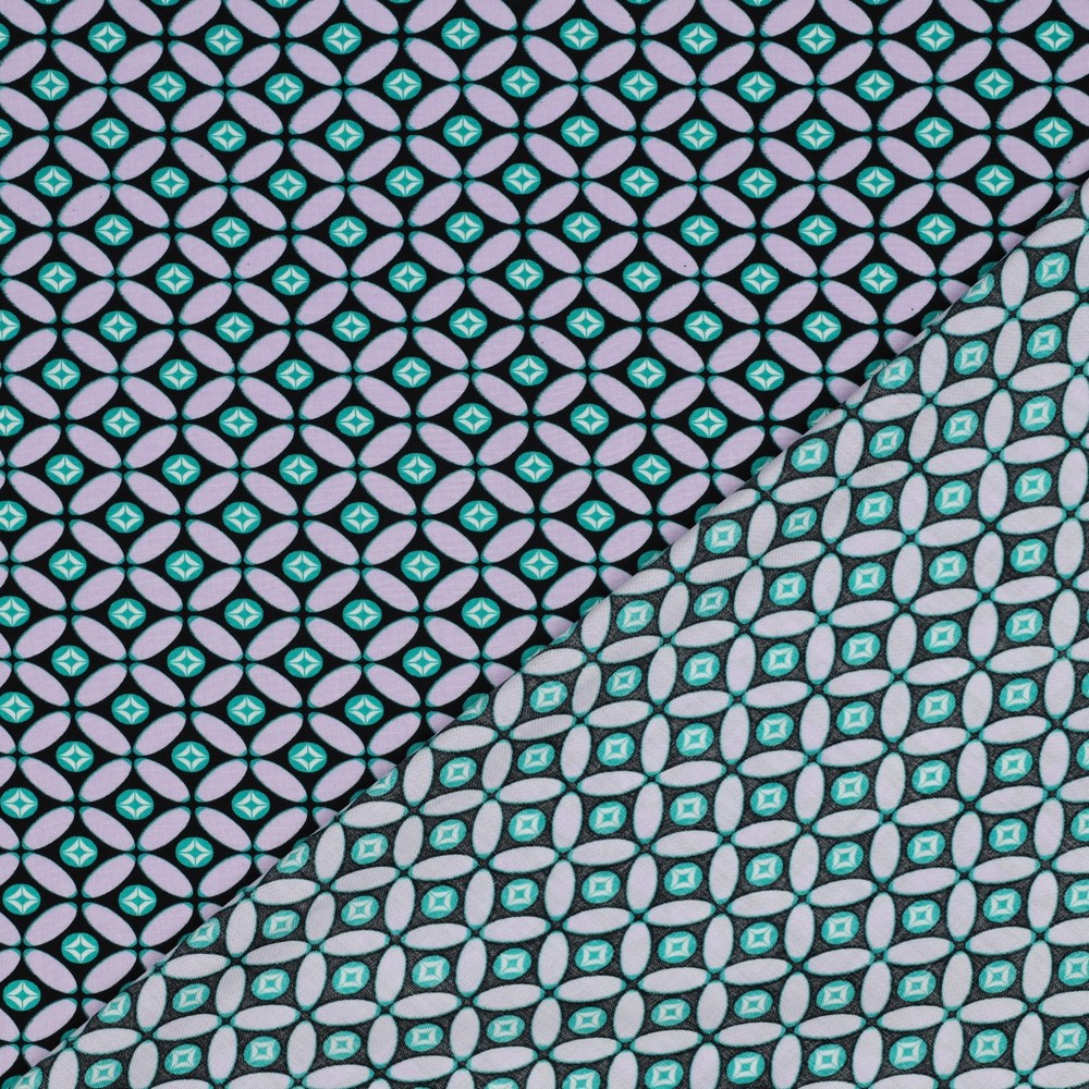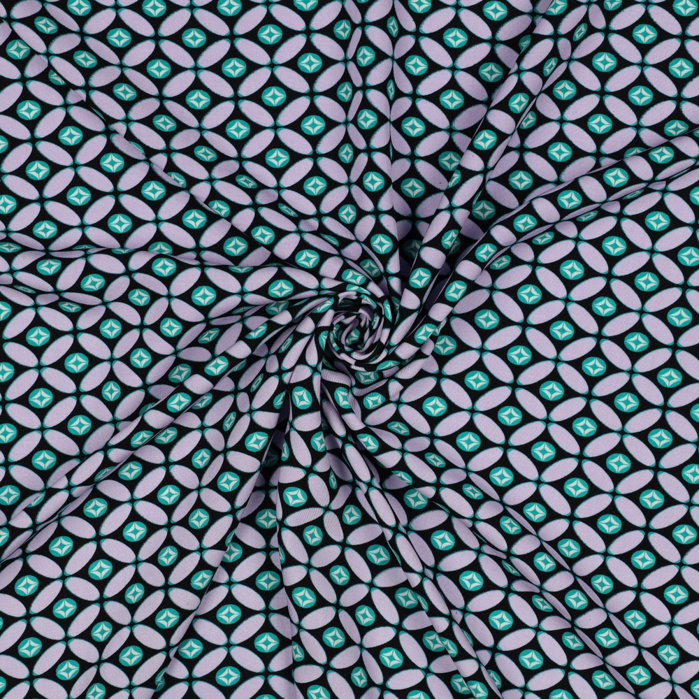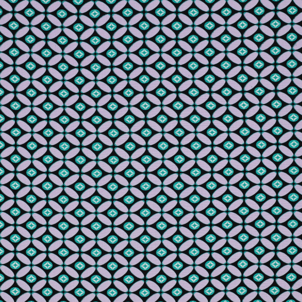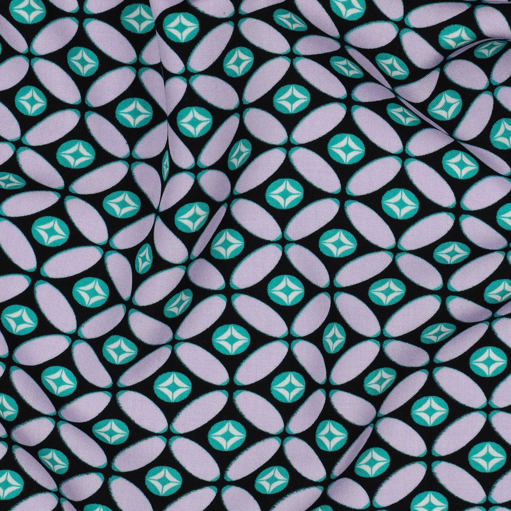 Een stof uit een andere tijd – en toch wonderbaarlijk modern: deze viscose met retroprint in zwart en lila trekt alle blikken. Het grafische patroon doet denken aan stijlvolle mid-century designs en geeft elk naai-project een elegante, licht speelse toets.