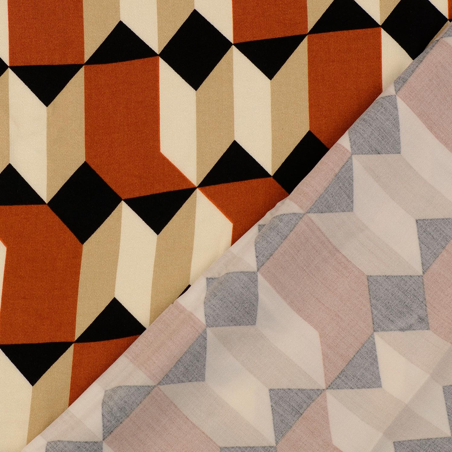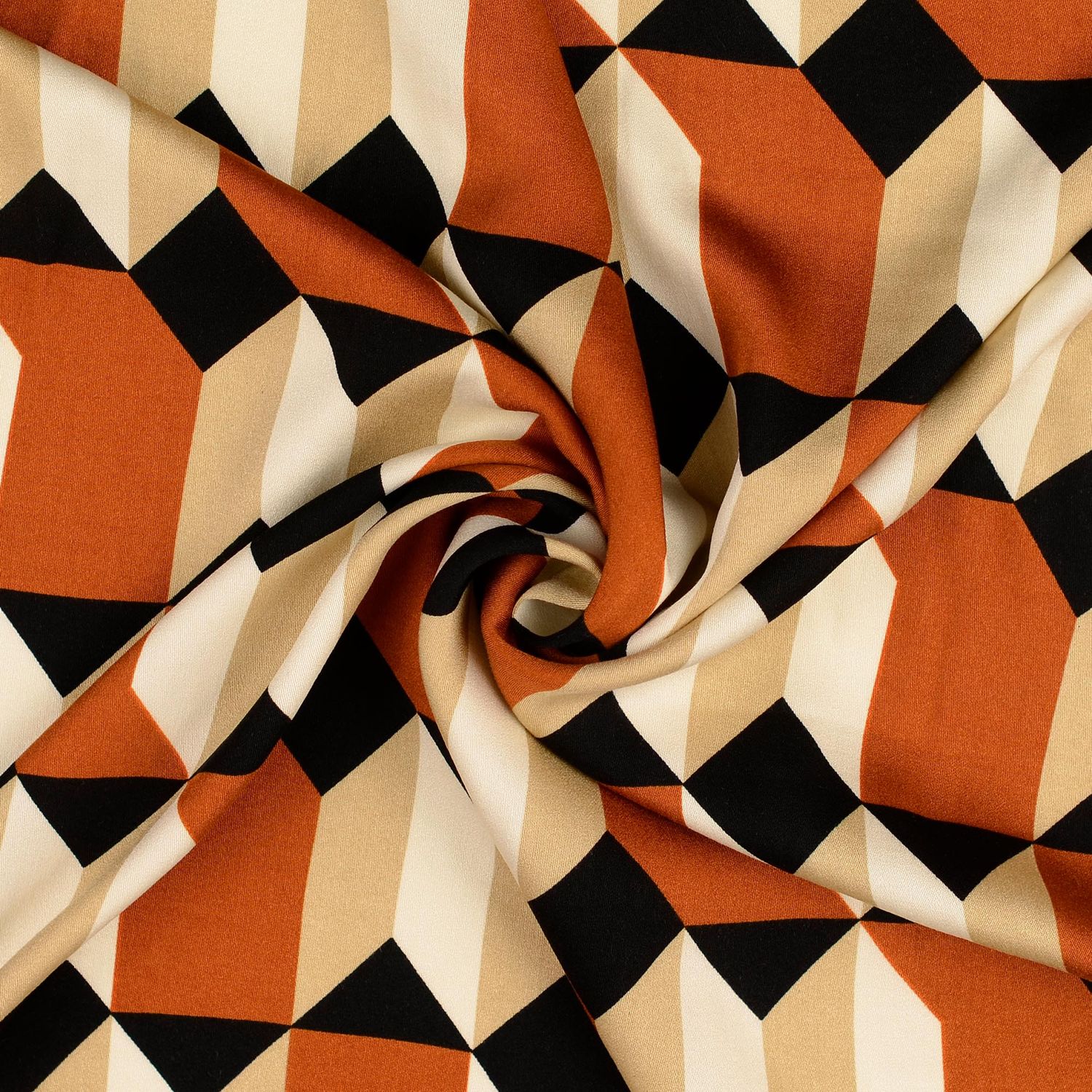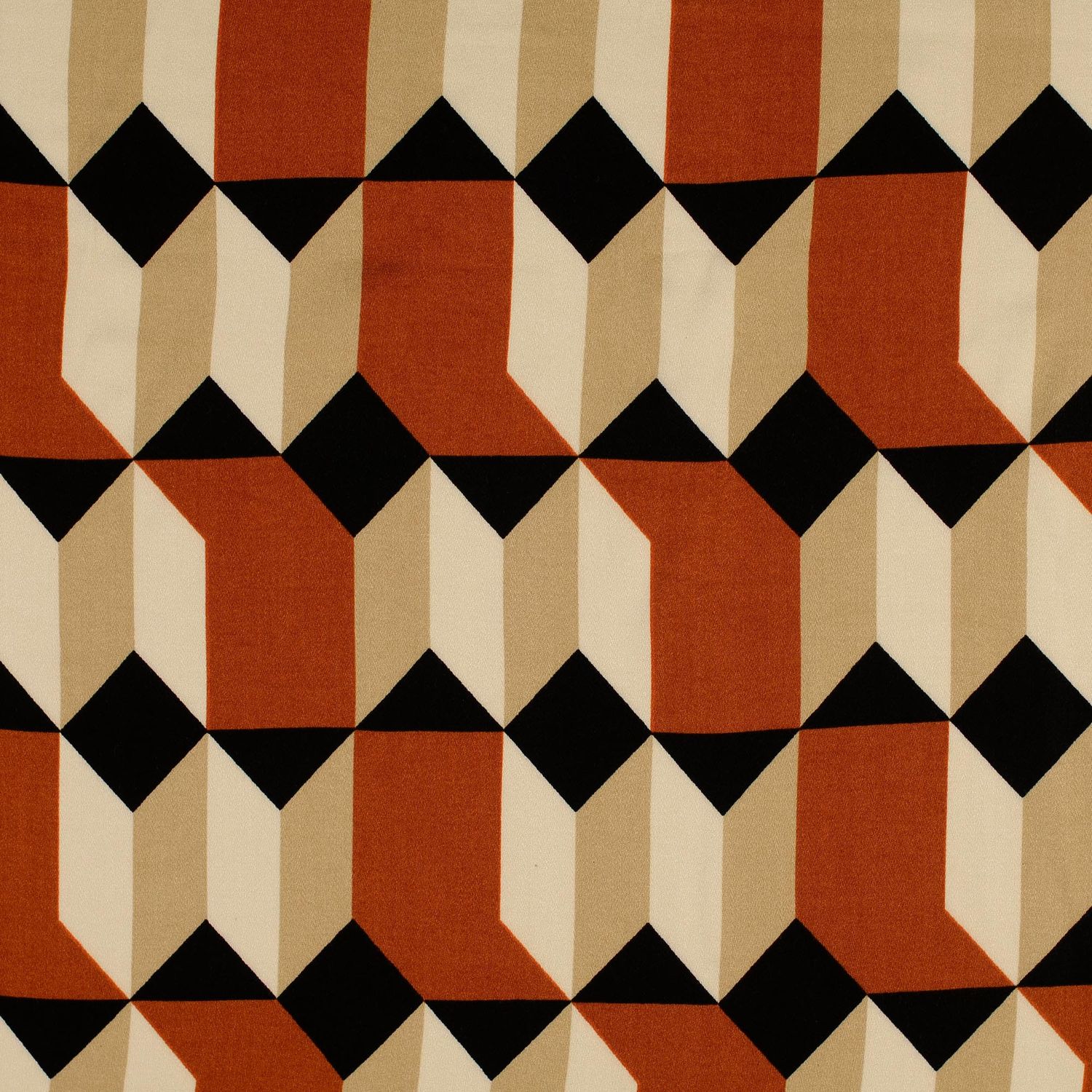 Een vleugje elegantie met een moderne twist: deze viscose satijn verleidt met een grafisch geo-design in warme roesttinten op chique ecru. Fijne lijnen en gestileerde vormen lijken op een kunstzachtige mozaïek en geven de stof een tijdloos-moderne uitstraling.