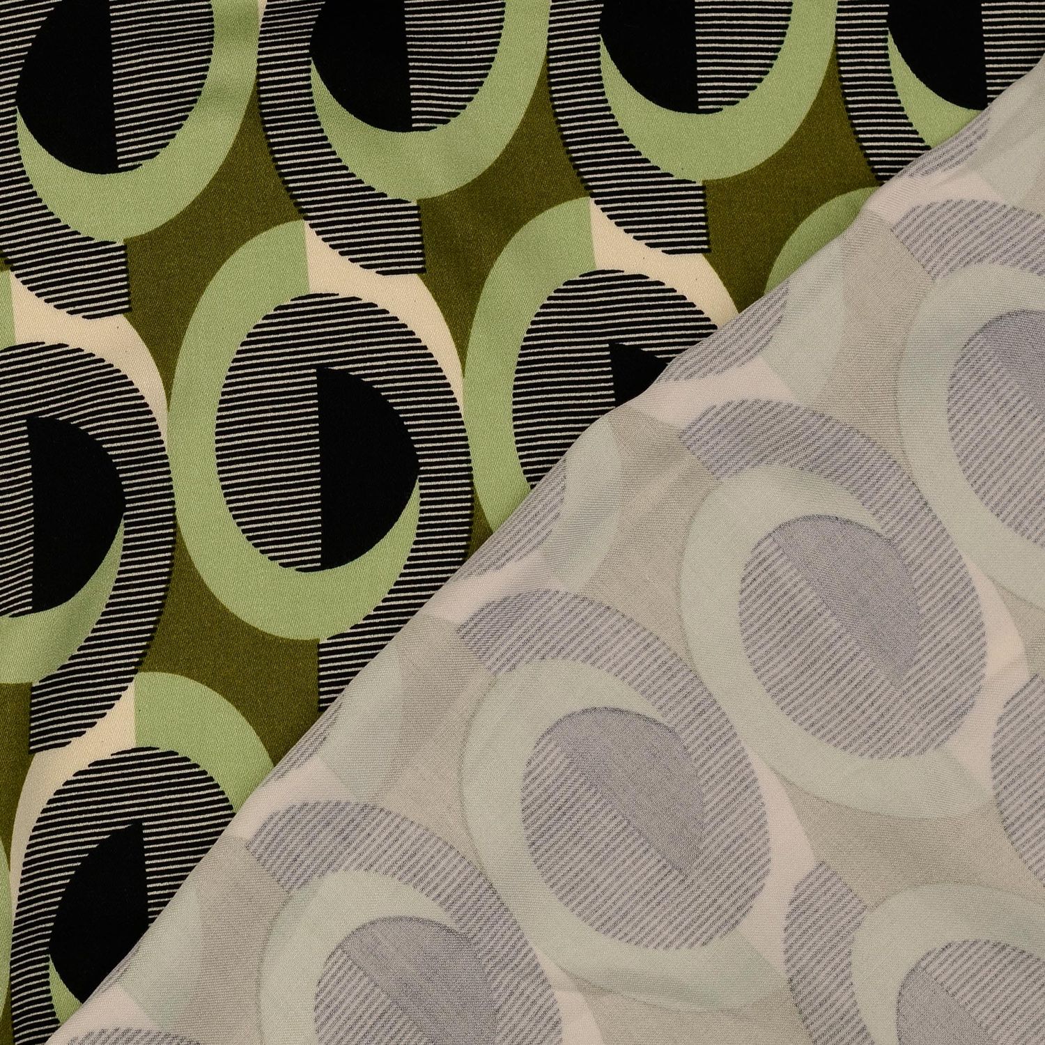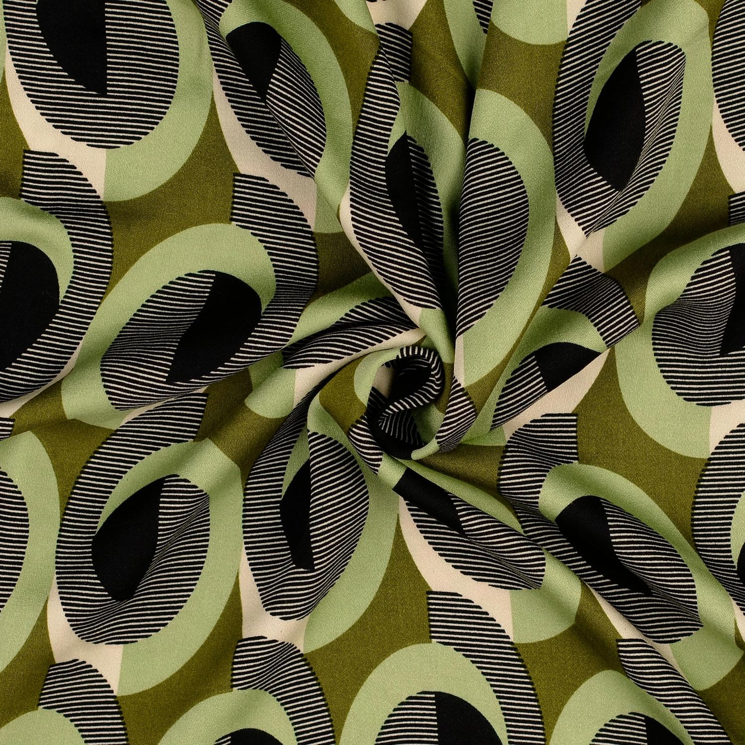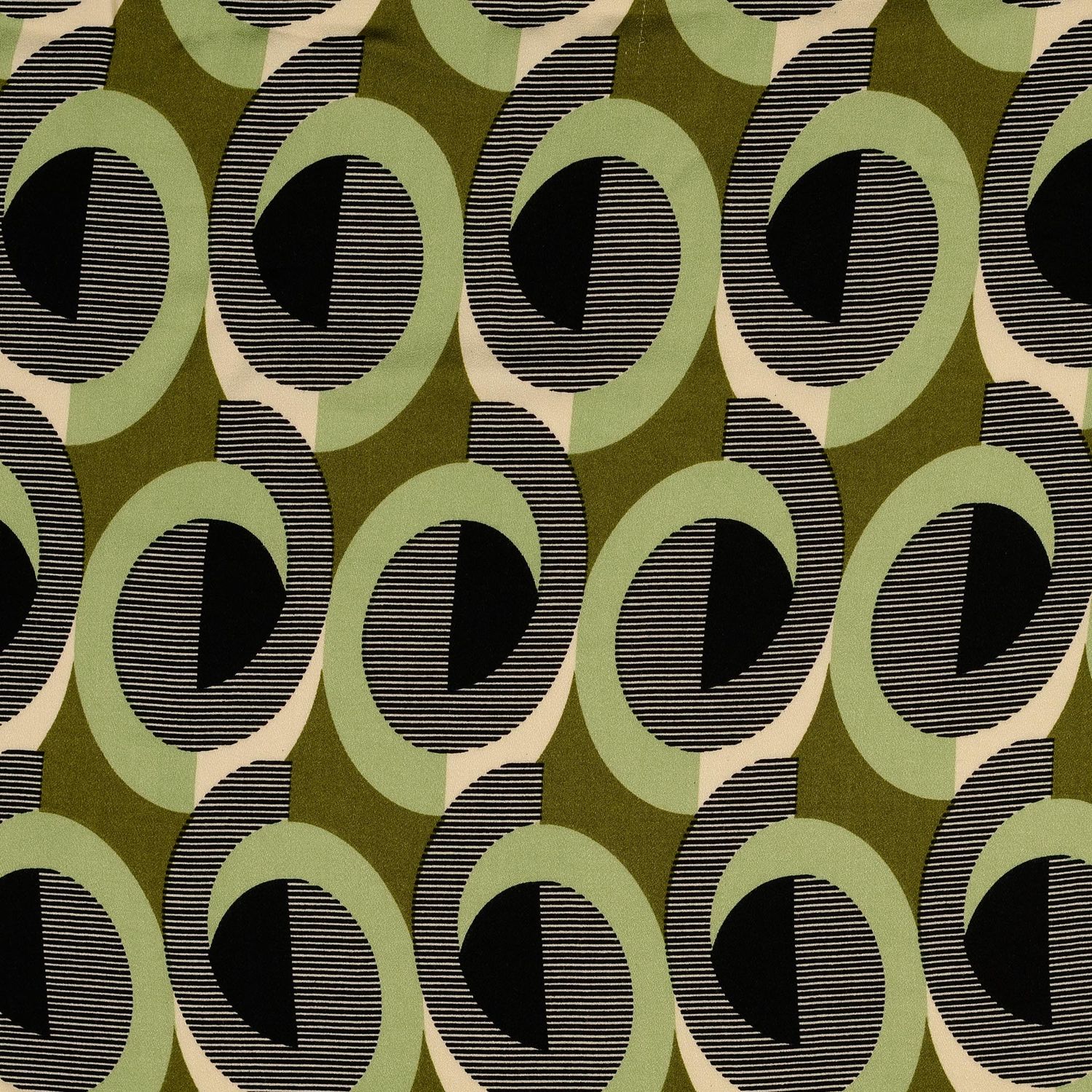 Deze elegante viscose satijn betovert met een stijlvol retro design in harmonieuze groentinten. Op de zacht glanzende ondergrond ontmoeten olijf- en minttinten elkaar en vormen een grafisch patroon dat doet denken aan tijdloze mid-century prints – modern geïnterpreteerd en tegelijk prachtig vrouwelijk.