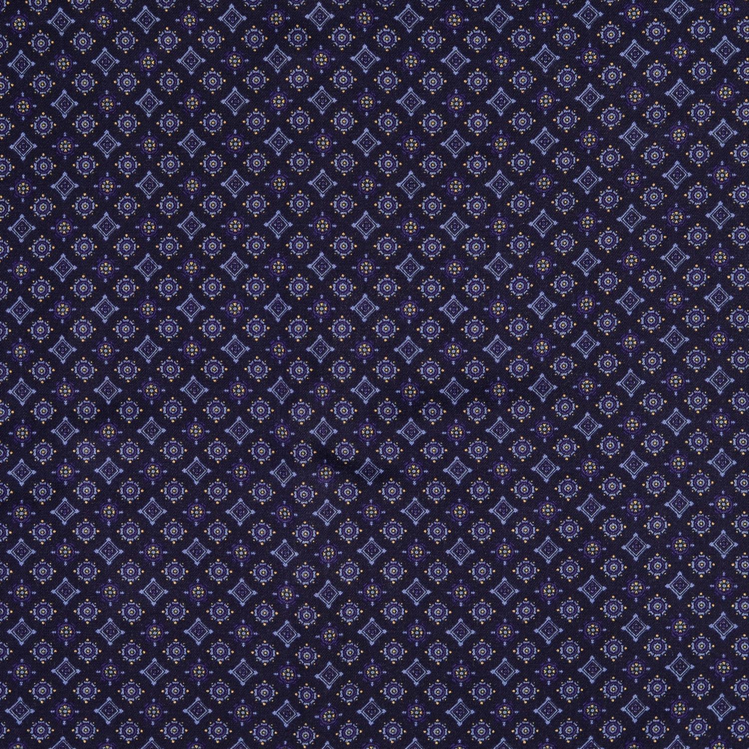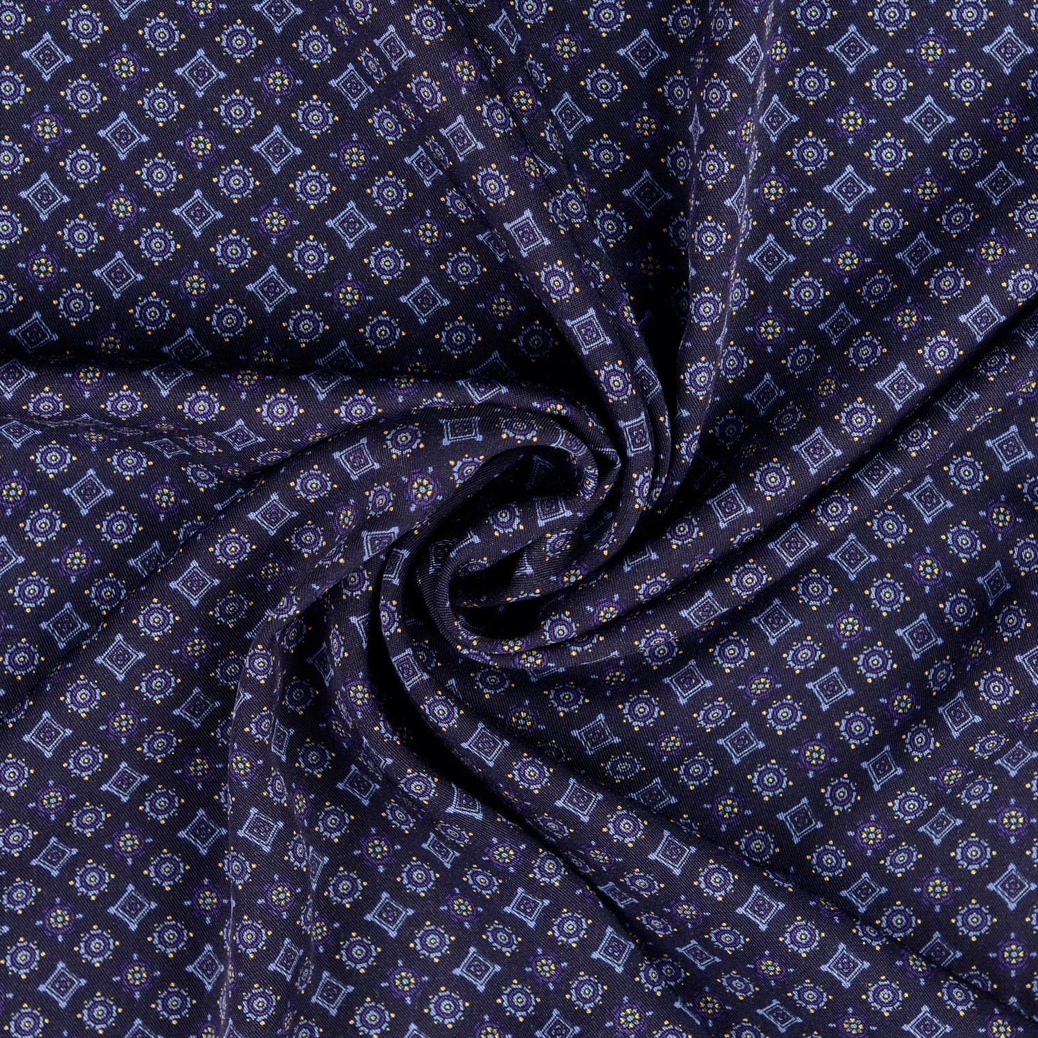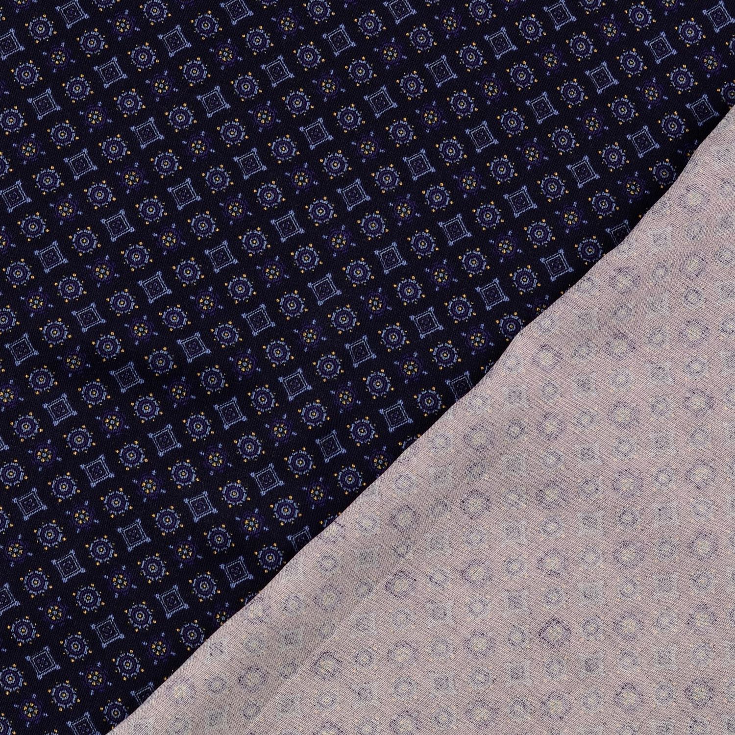 Een elegante motiefmix in een chique navy – deze viscose-twill geeft elk naaiproject een bijzondere uitstraling. Op de diepblauwe achtergrond bewegen zich delicate, lichte mini-motieven die lijken op kleine penseelstreken of fijne stippen, waardoor de stof een levendig maar toch rustig karakter krijgt.