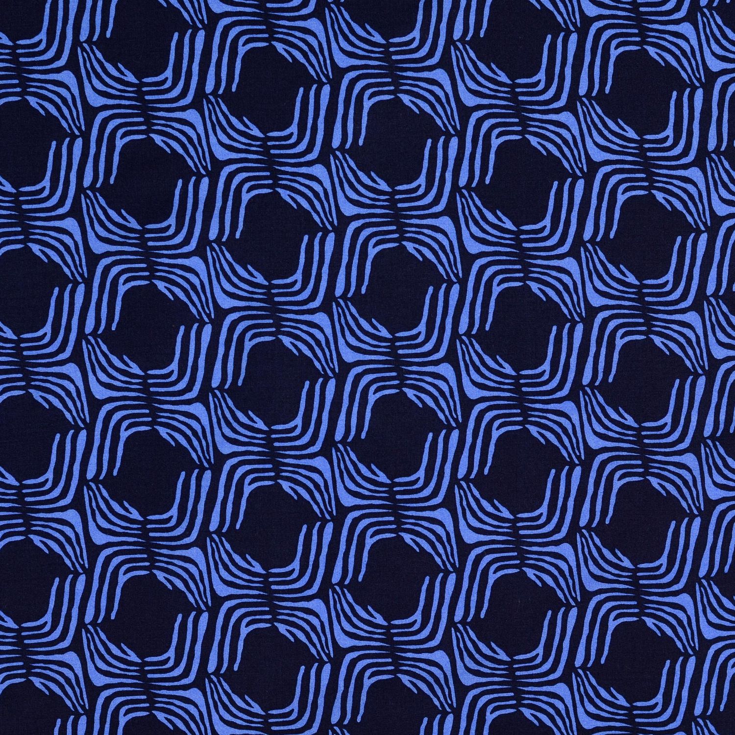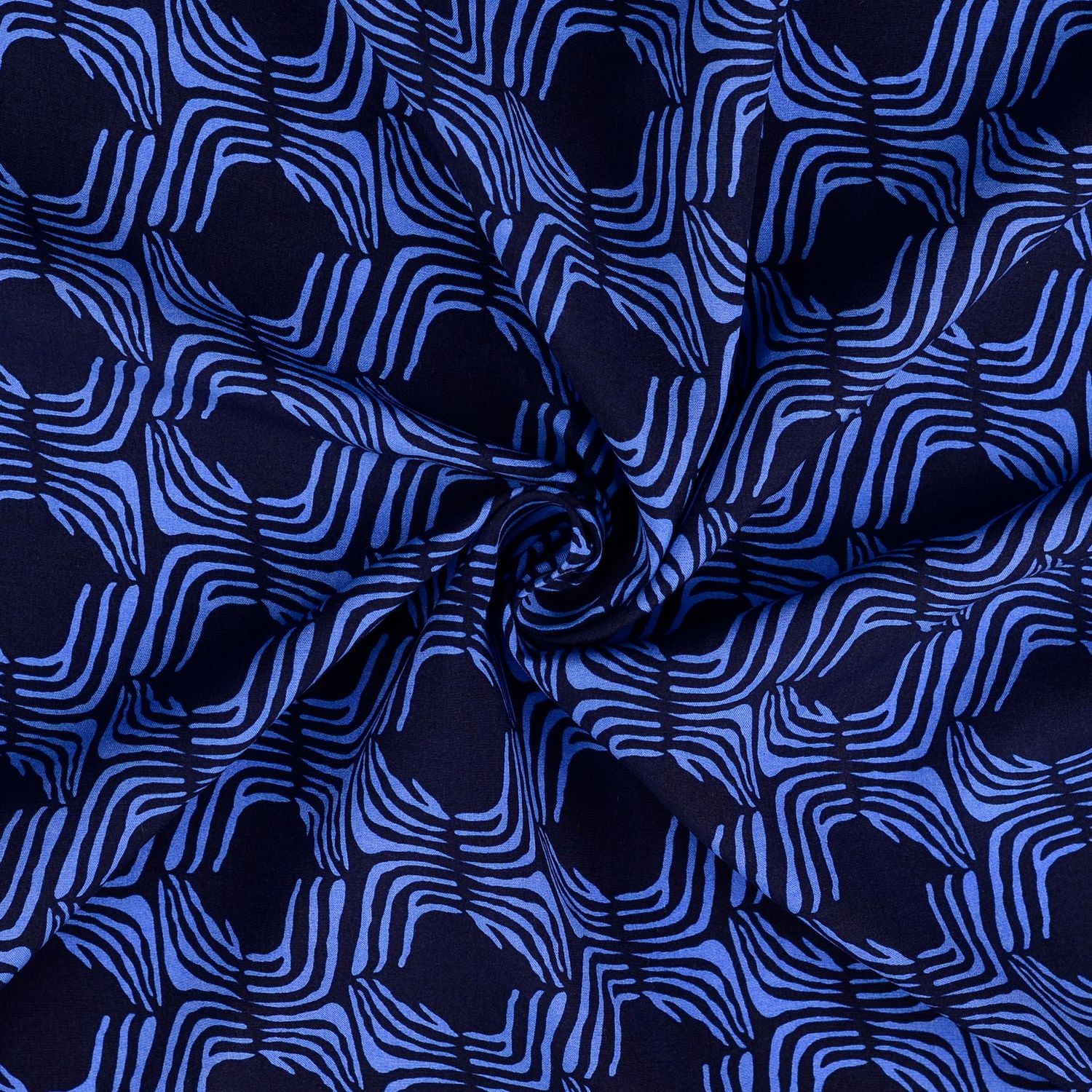 Een stof als uit een stijlvolle vintagefilm: deze viscose-twill verleidt met een expressief retrodesign in donkerblauw en koningsblauw. Het patroon doet denken aan grafische mid-century elementen en oogt zowel modern als tijdloos – perfect voor wie van een bijzondere look houdt.