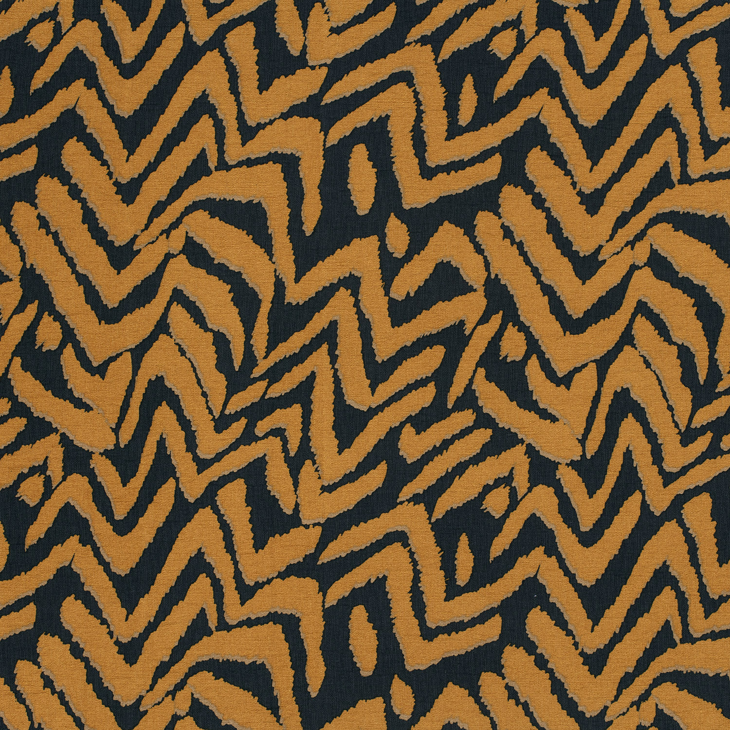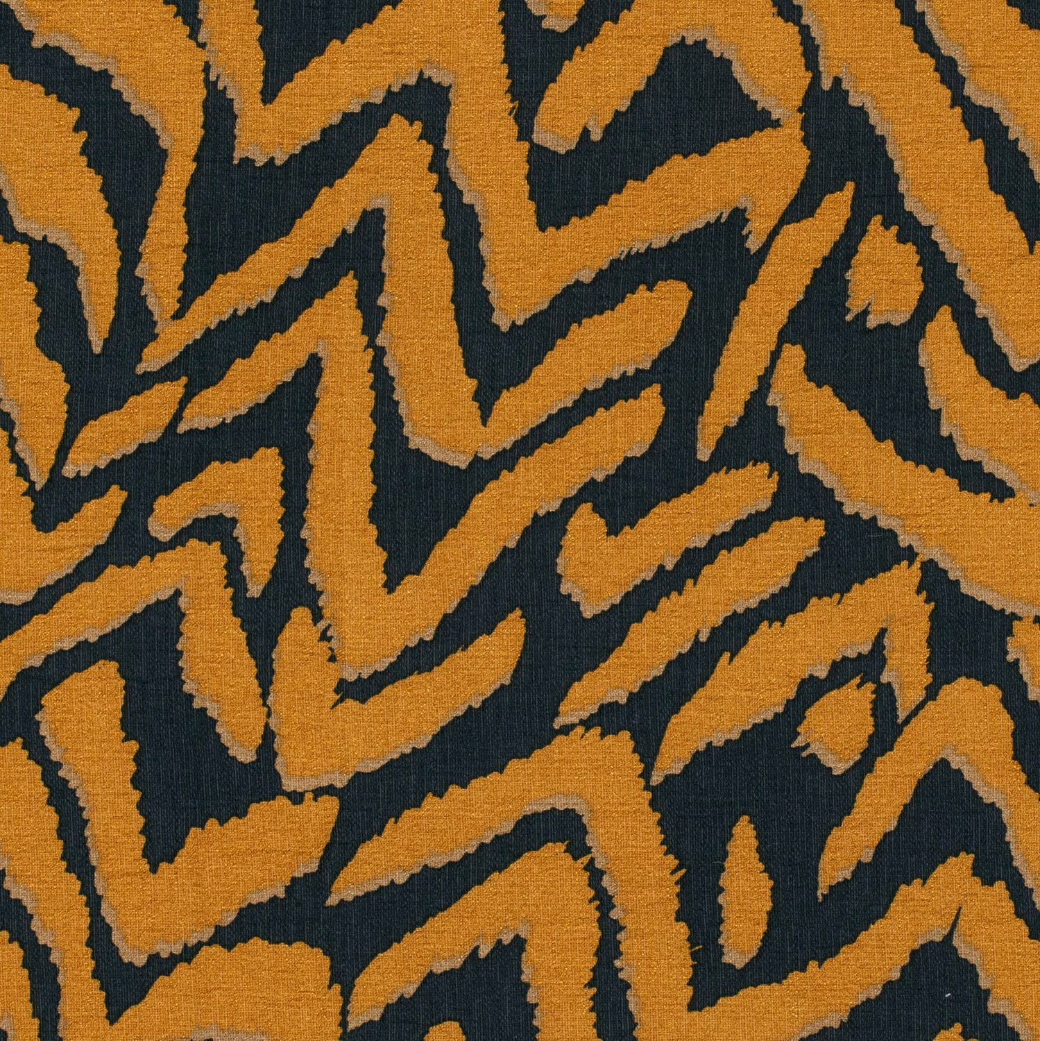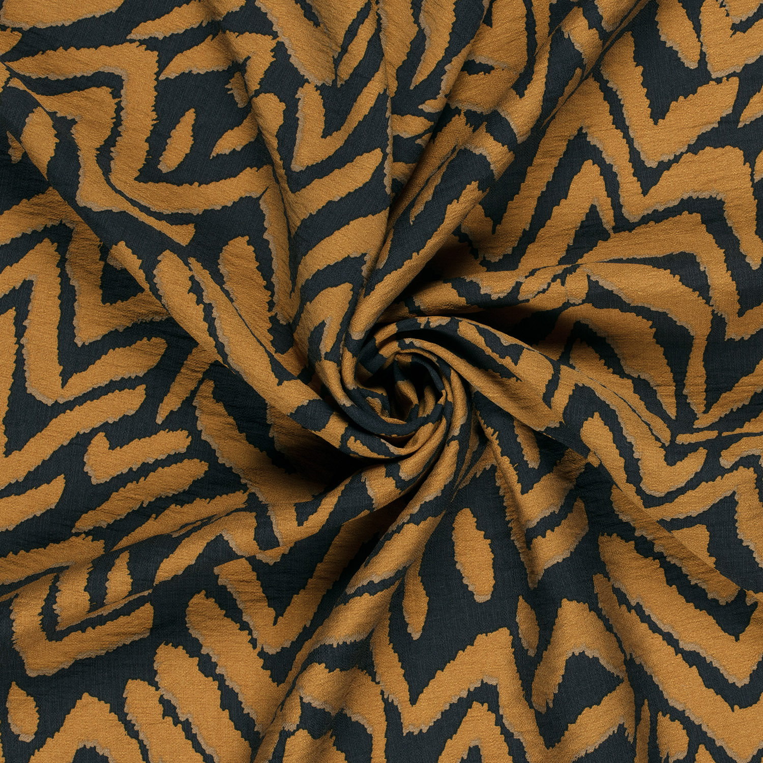 Deze verfijnde viscose stof trekt alle aandacht: het opvallende zigzagpatroon in diep zwart wordt doorbroken door fijne lijnen in een warme glanzende koperkleur. Zo ontstaat een moderne, grafische look met een vleugje glamour – perfect voor wie van eenvoudige elegantie met een bijzonder detail houdt.