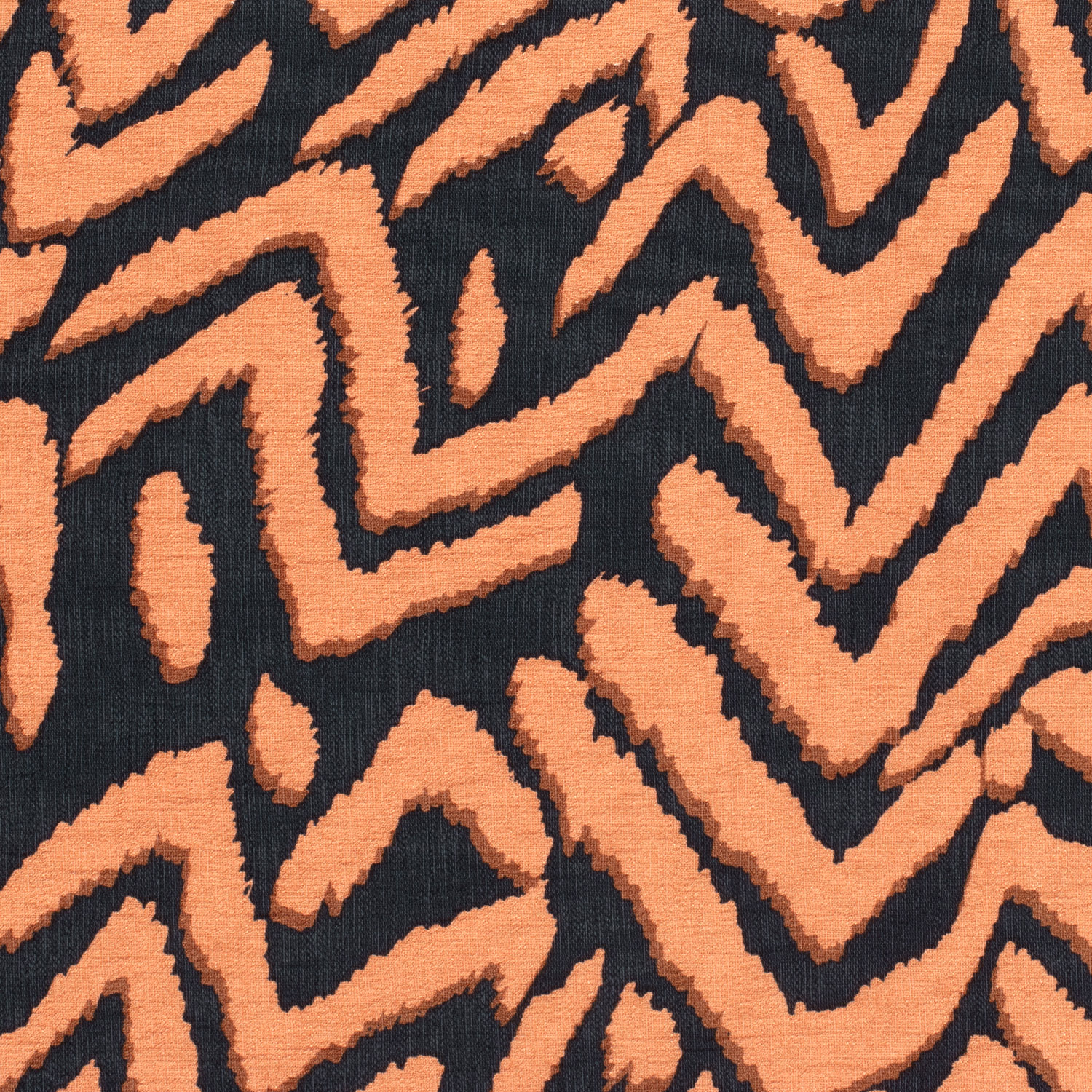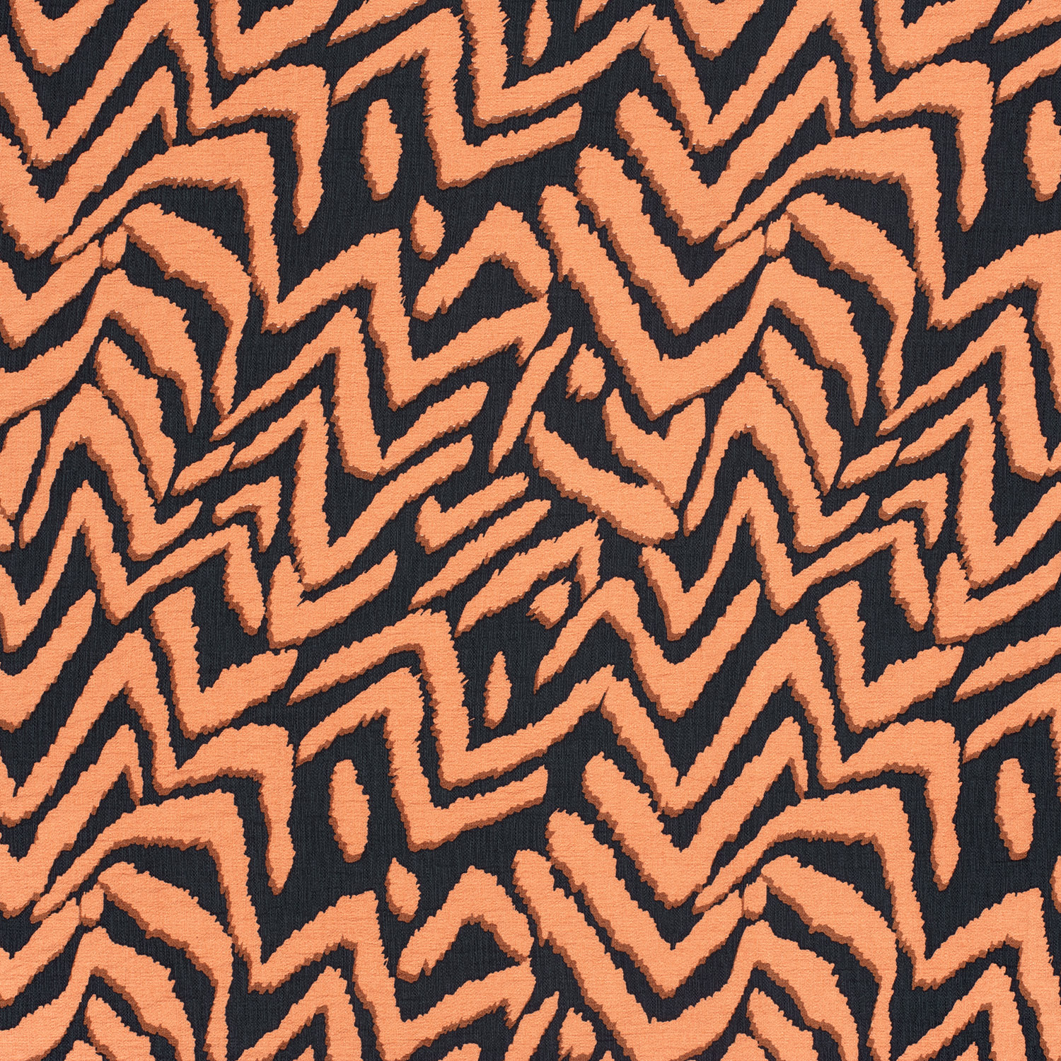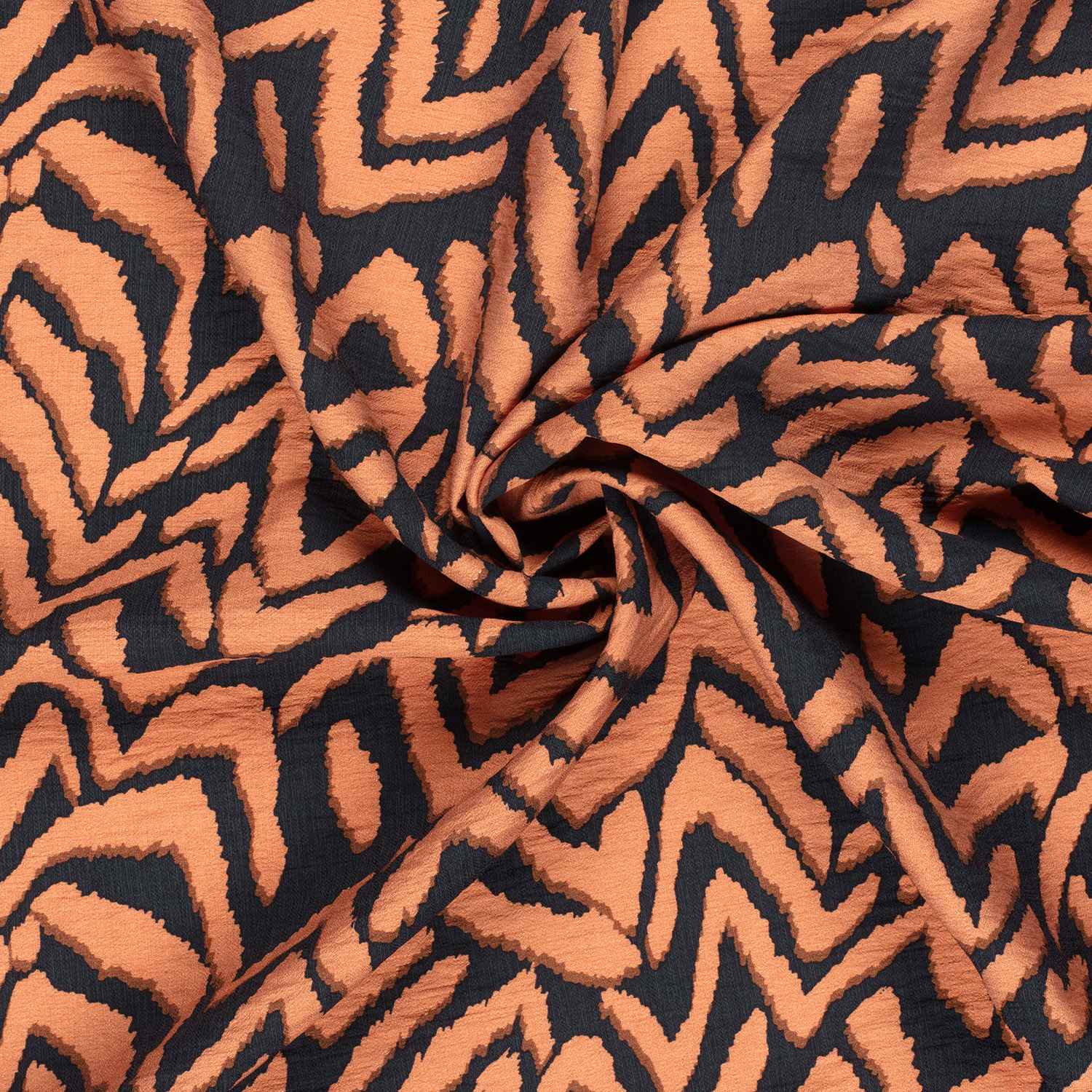 Een modern blikvanger met grafische charme: Deze viscose stof valt op door een opvallend zigzagpatroon in diep zwart en warm baksteenrood. De duidelijke lijnen lopen ritmisch over de stof en creëren een spannende maar toch harmonieuze contrast – perfect voor wie een stijlvolle statement wil maken.