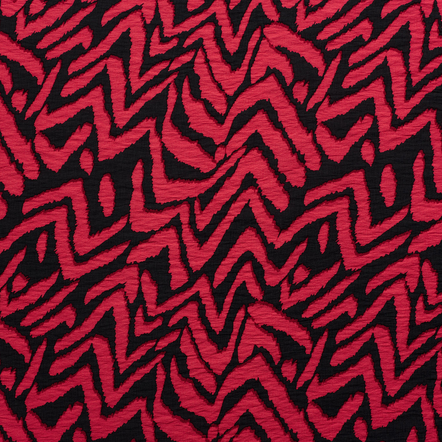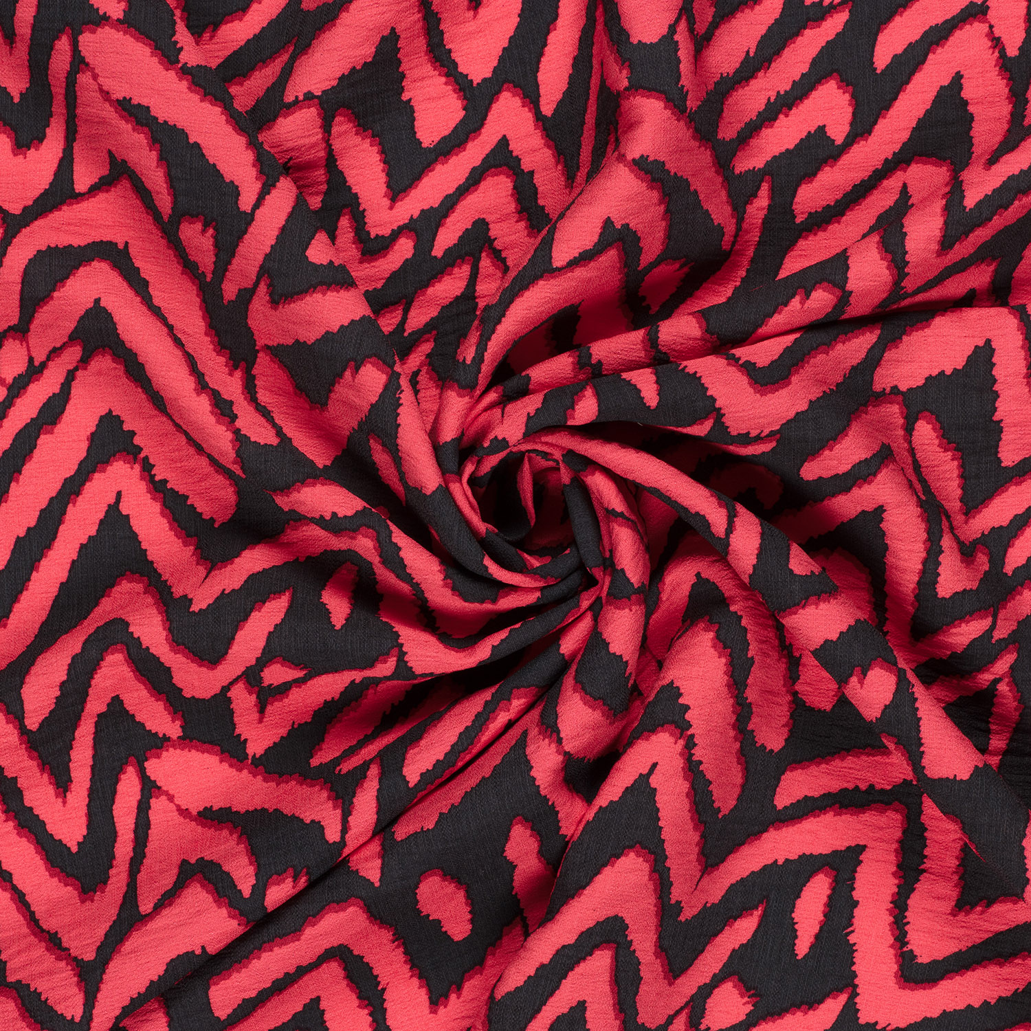 Deze viscose stof trekt alle blikken naar zich toe: het opvallende zigzagpatroon in fel rood en diep zwart zorgt voor een sterke, moderne uitstraling. De heldere, grafische lijnen geven het ontwerp een dynamisch effect – perfect als je outfit of naai-project een echt statement moet maken.