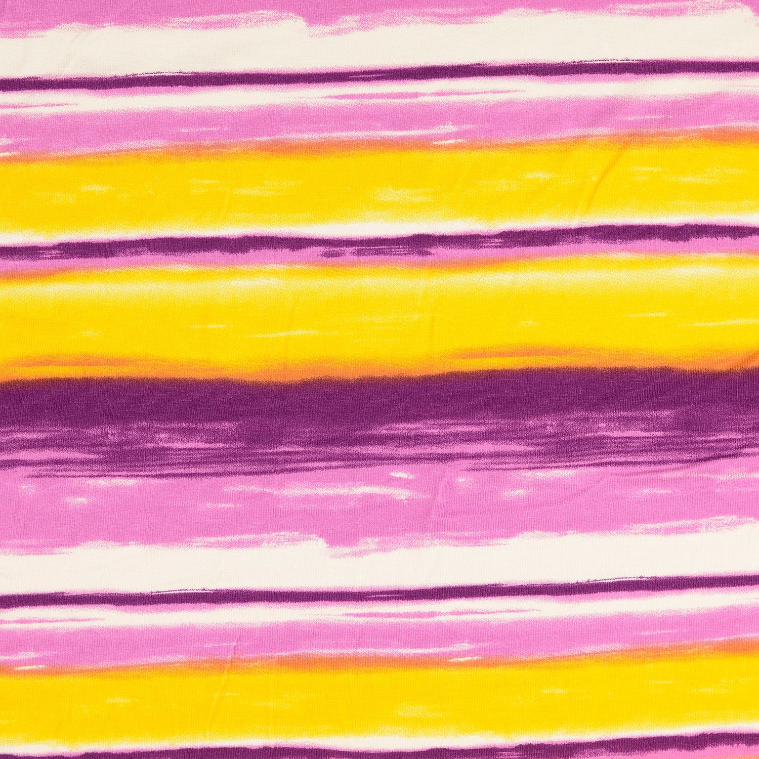 Zachte aquarelstrepen in paarse en gele tinten geven deze viscosejersey een bijzondere, artistieke uitstraling. De zacht in elkaar overlopende kleuren doen denken aan een geschilderde zonsondergang en ogen tegelijkertijd fris, modern en vrouwelijk.
