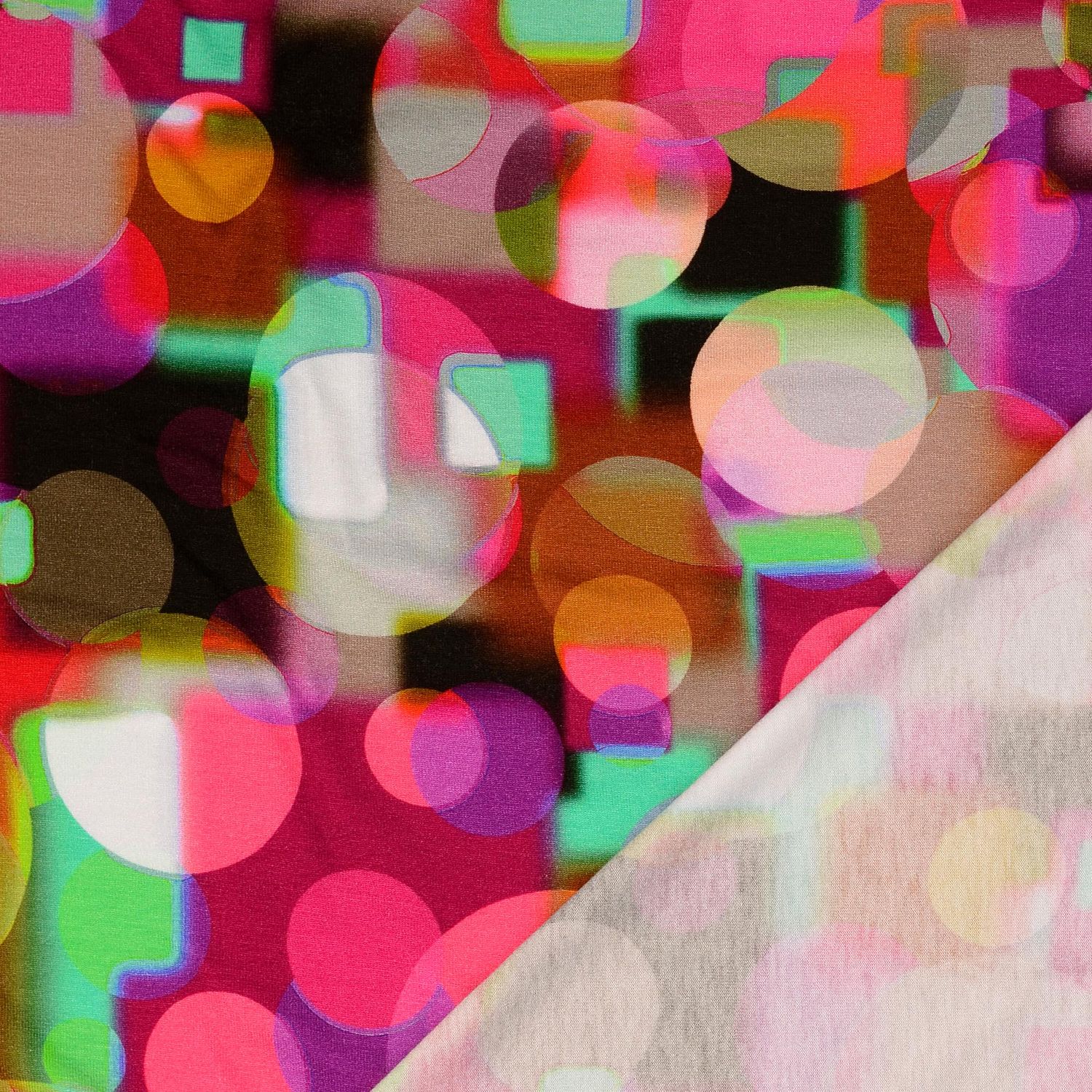 Een bijzondere jersey die meteen in het oog springt: Op de zachte roze achtergrond zweven decoratieve balletjes en cirkels in harmonieuze pasteltinten – van zachtroze tot warm beige en subtiel grijs. In sommige van deze balletjes verschijnen gestileerde vrouwenportretten met fijne gelaatstrekken en kunstzinnig gesuggereerd haar, alsof het kleine kunstwerken zijn in een moderne lijst.