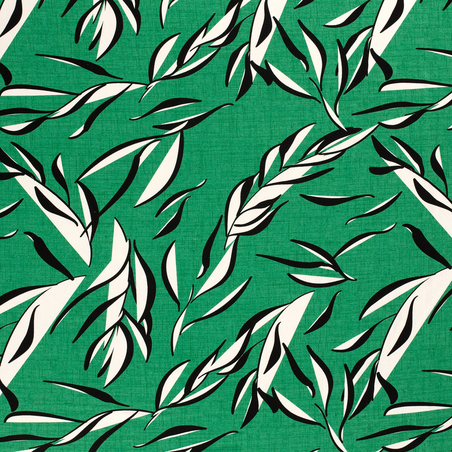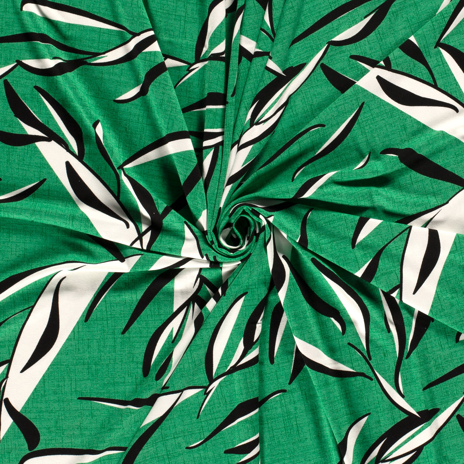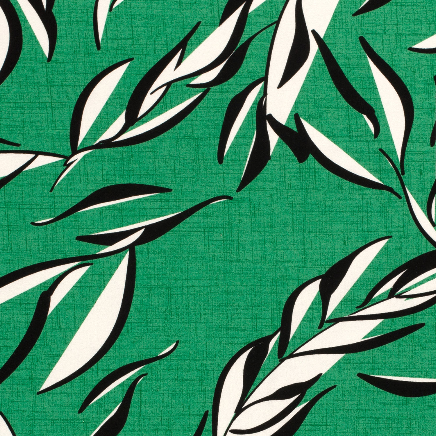 Deze viscosejersey brengt frisse junglevibes in je naai-projecten: grote, gedetailleerd getekende bladeren in een diepe grasgroene kleur spreiden zich uit over de stof en ogen tegelijk levendig en elegant. De bladvormen overlappen licht en creëren een mooi, natuurlijk spel van licht en schaduw – alsof je onder een groen bladerdak wandelt.