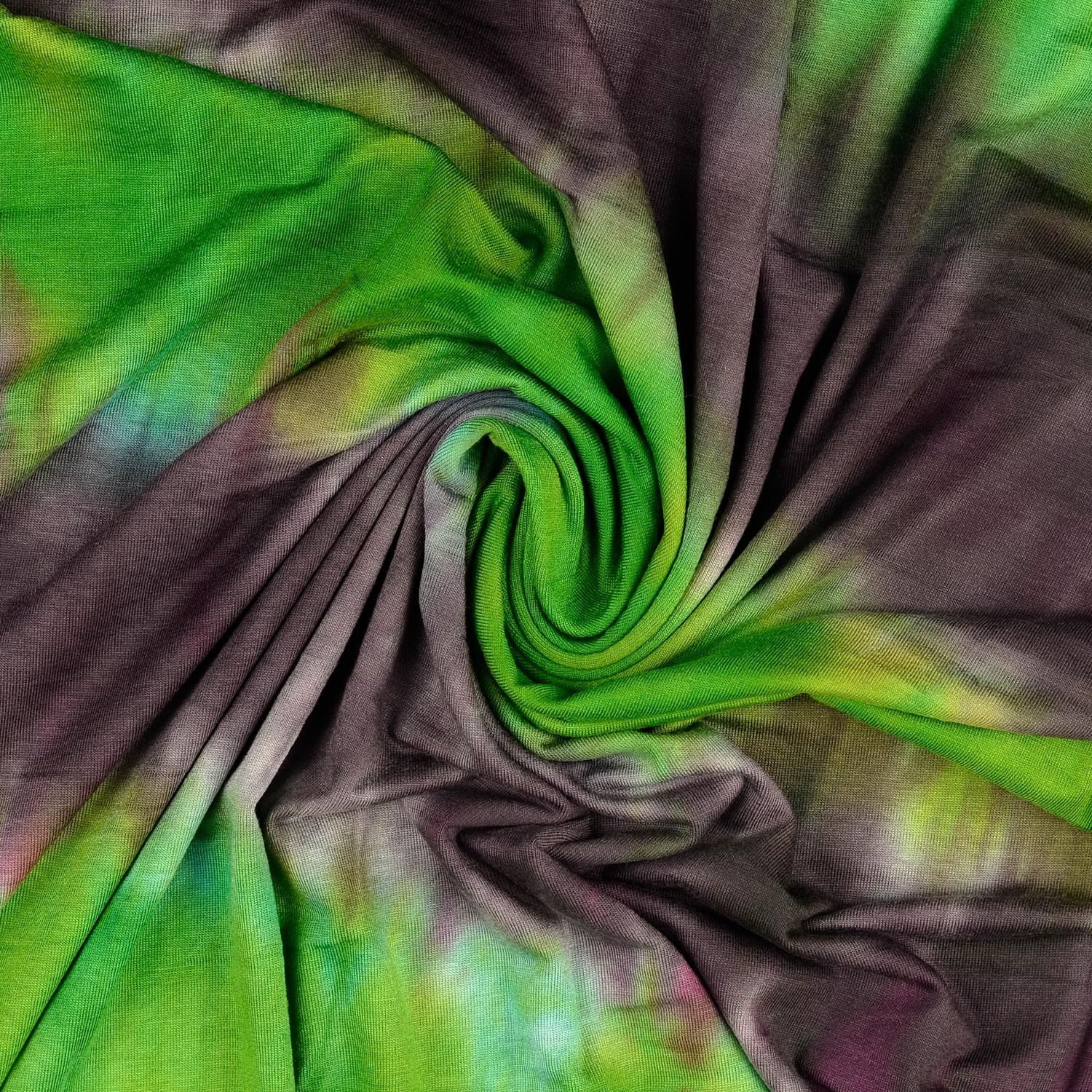 Deze viscosejersey brengt pure zomerse sferen in je naai-projecten: het moderne tie-dye ontwerp verloopt in levendige groentinten – van zacht mint tot diep smaragd – en wordt doorspekt met delicate, bijna wolkachtige witte nuances. De zachte kleurverlopen doen denken aan door de zon verbleekte strandlakens, tropische planten en zwoele zomeravonden.