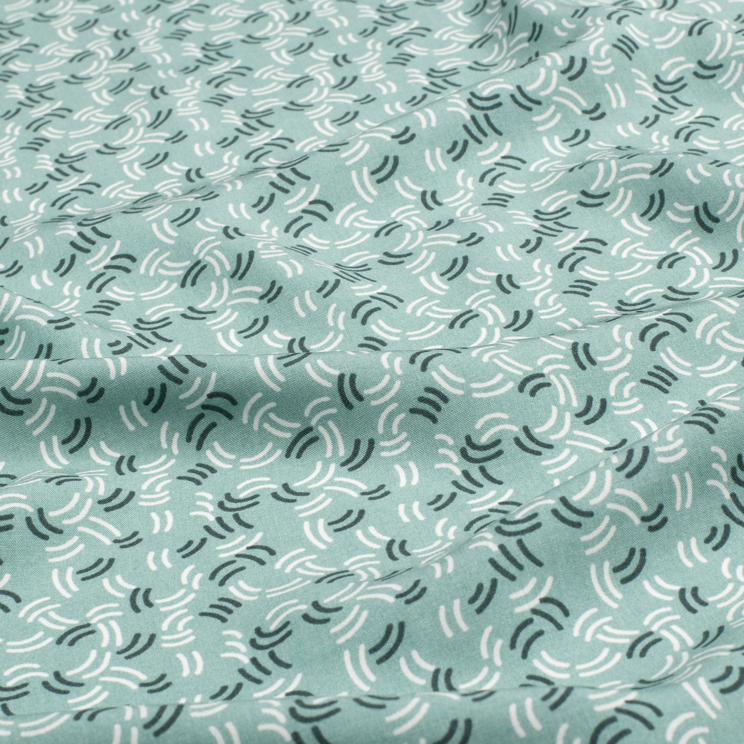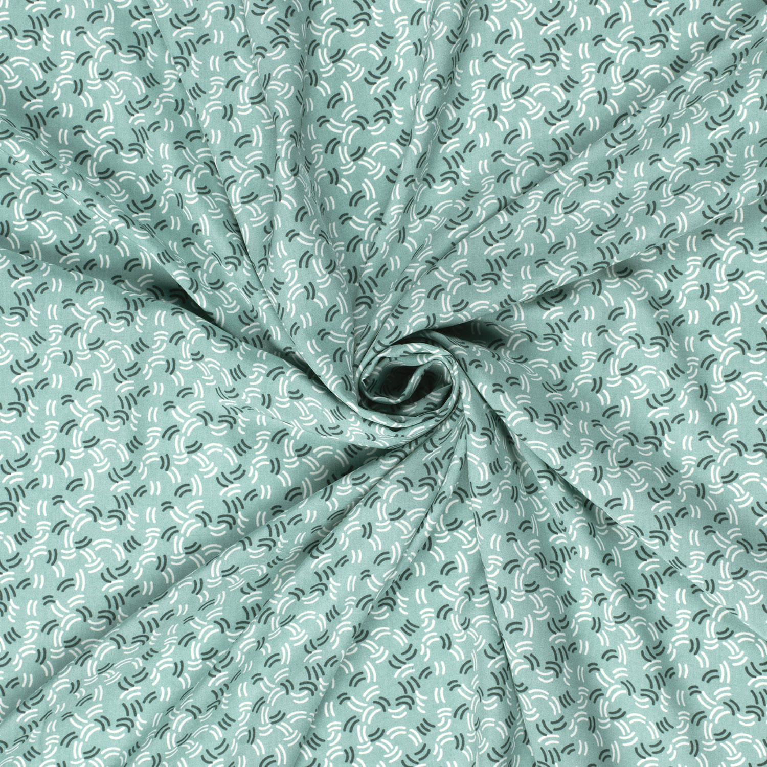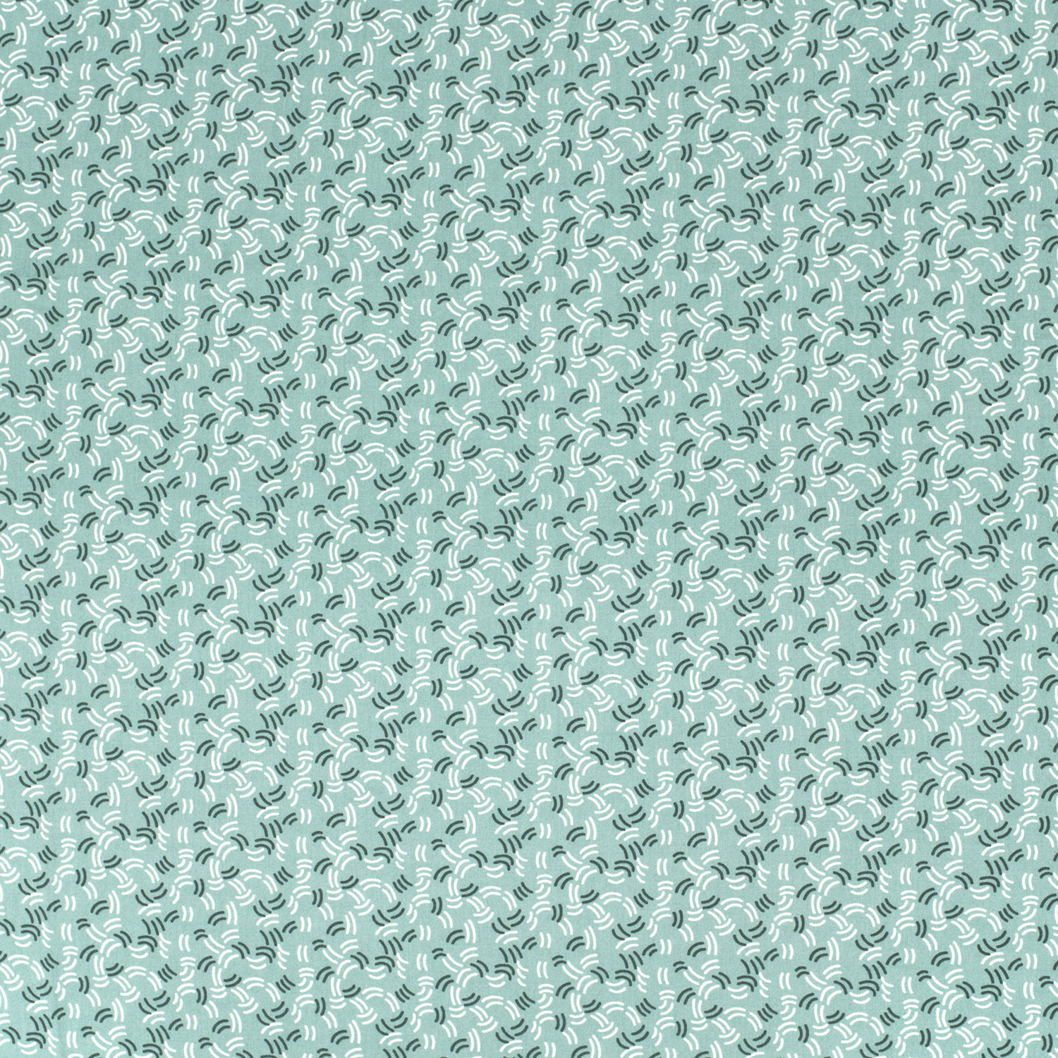 Zacht, licht en heerlijk speels: deze stof in elegant donkermunt betovert met een fijn patroon van kleine, halve cirkelbogen die gelijkmatig over het hele oppervlak lopen. De bogen lijken op gestileerde golven of kleine regenbogen en geven het ontwerp een modern maar tegelijkertijd zeer zacht uiterlijk.