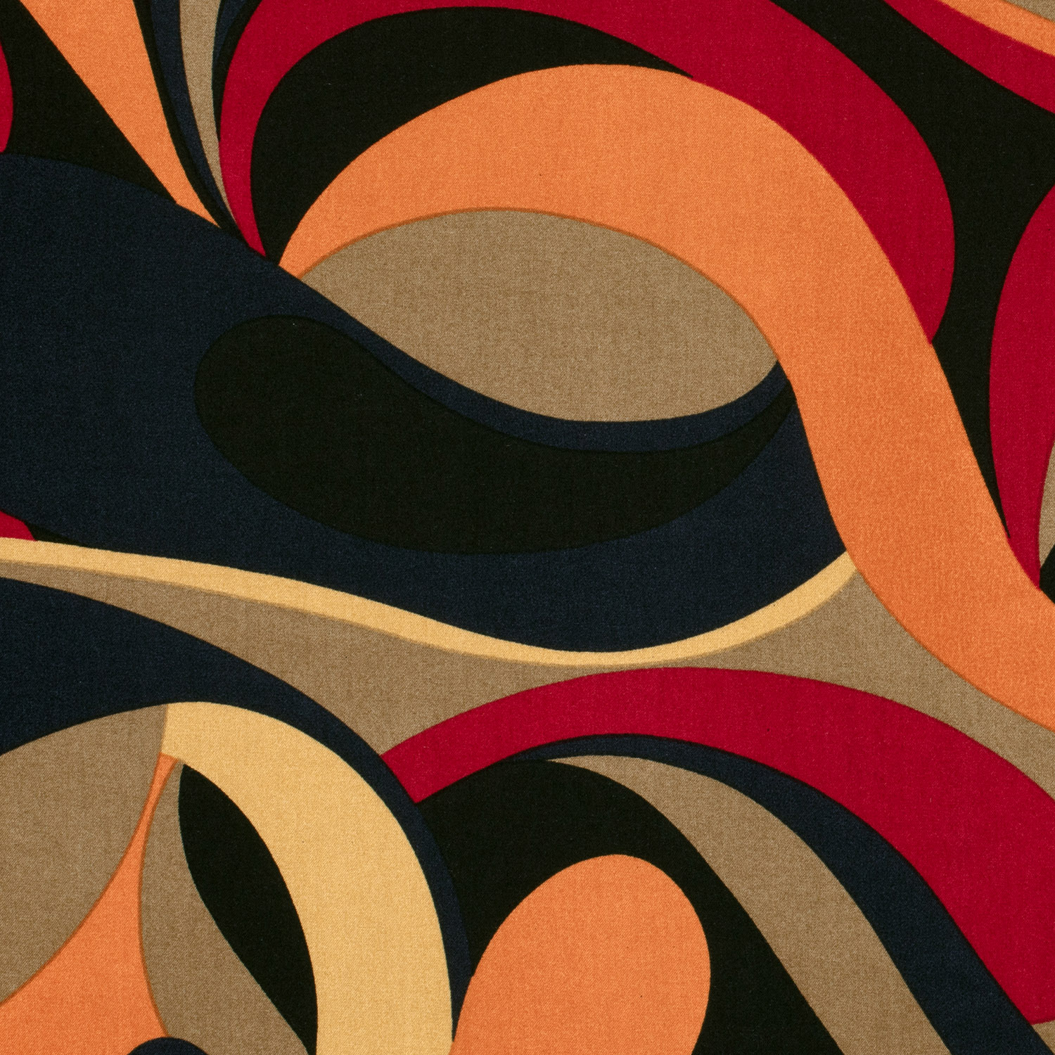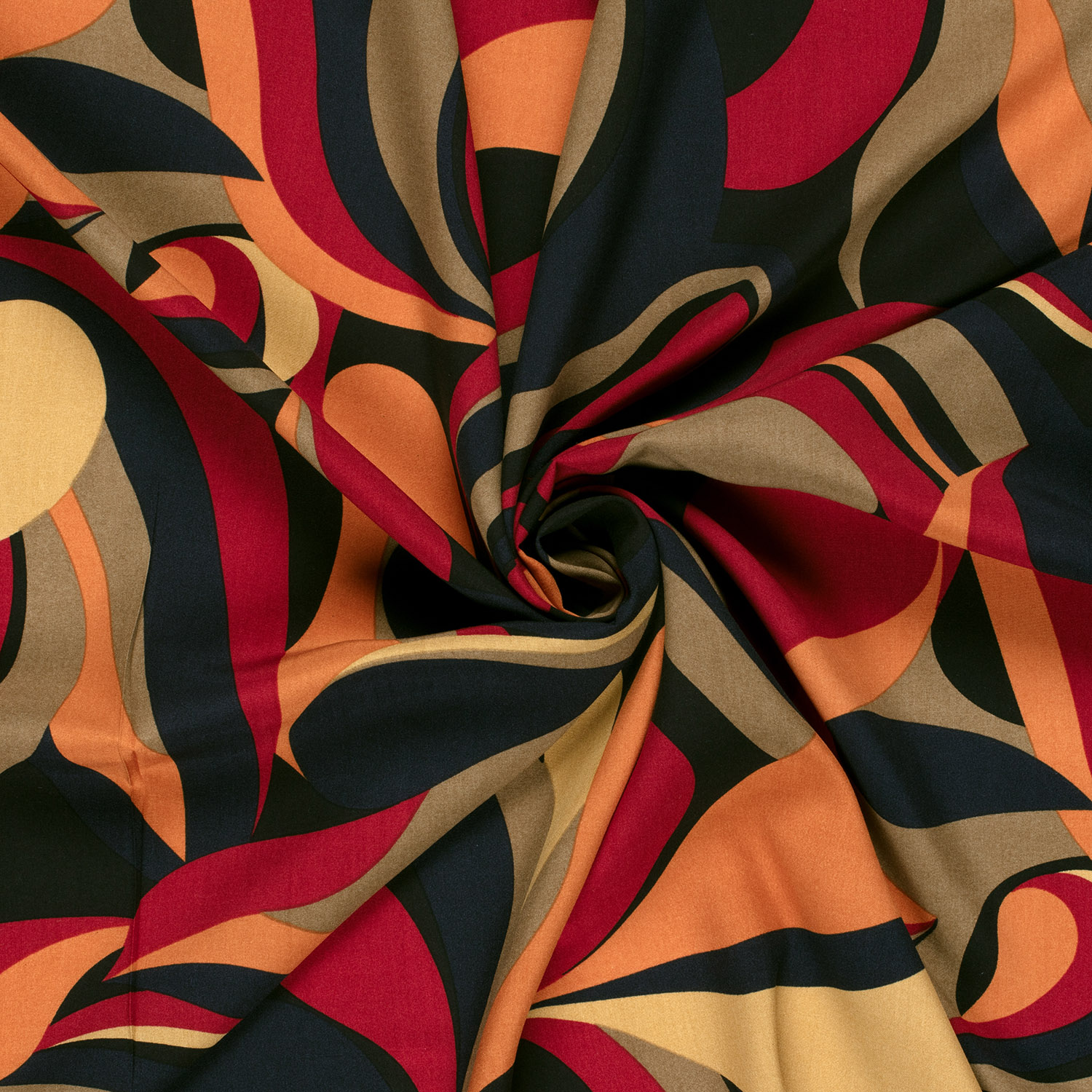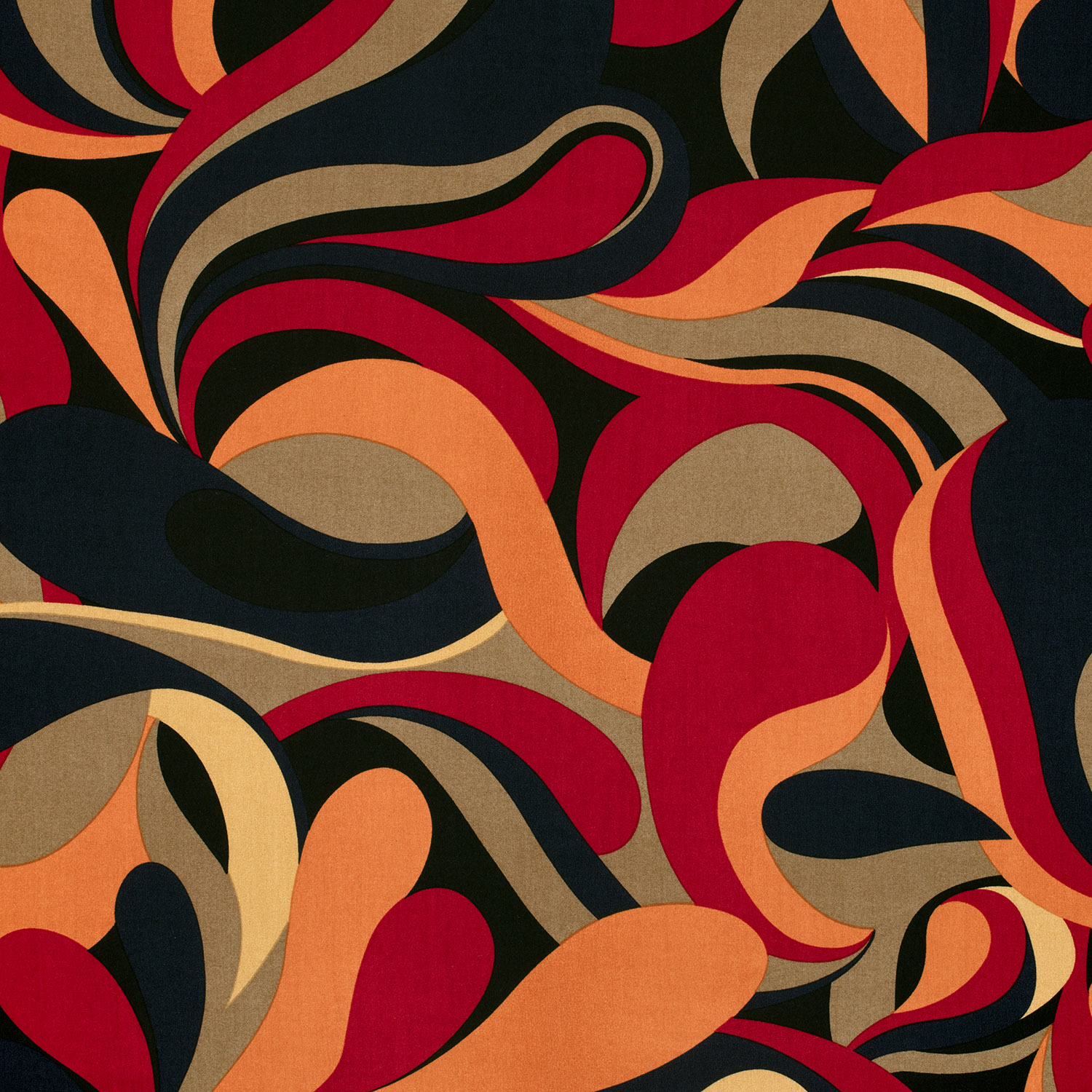 Deze viscosepopeline betovert met een levendig retrodessin van kleine, gestileerde druppels in warme rood- en oranjetinten, opgefrist met delicate beige en crèmekleurige accenten. Het grafische patroon doet denken aan mid-century design en brengt meteen een gevoel van vintage charme en vrolijkheid in elk naai-project.