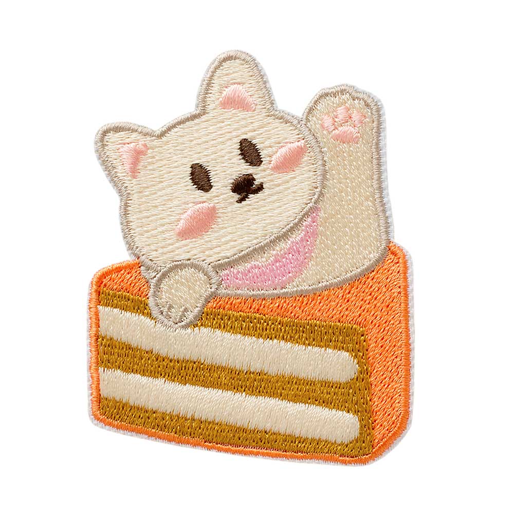 Deze suikerzoete patch toont een kleine kat die nieuwsgierig uit een roze taart tuurt - een speels motief dat je meteen in een goed humeur brengt. Delicate roze- en crèmetinten ontmoeten lieflijke details zoals de fijne contouren van de kat en de decoratieve versieringen op de taart.