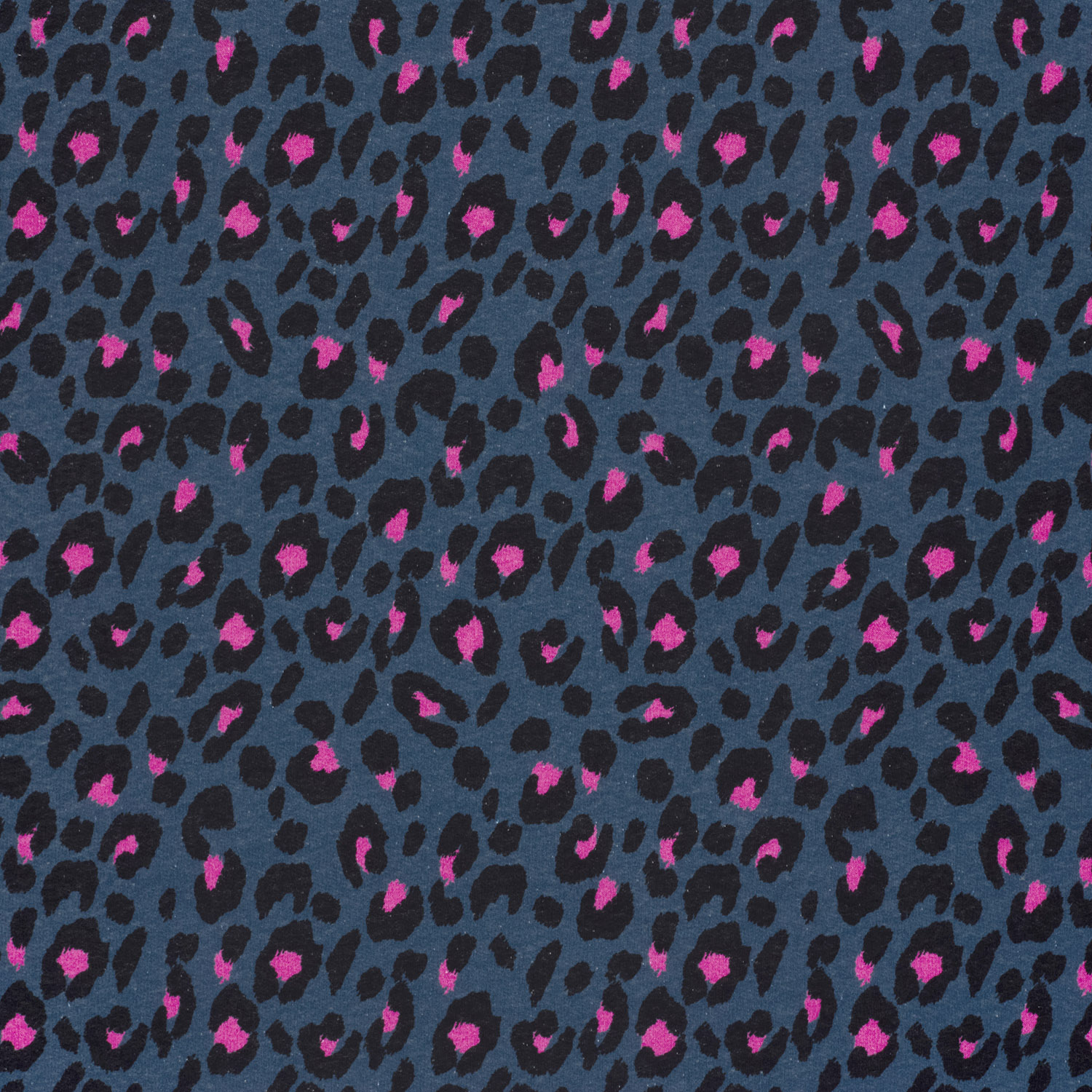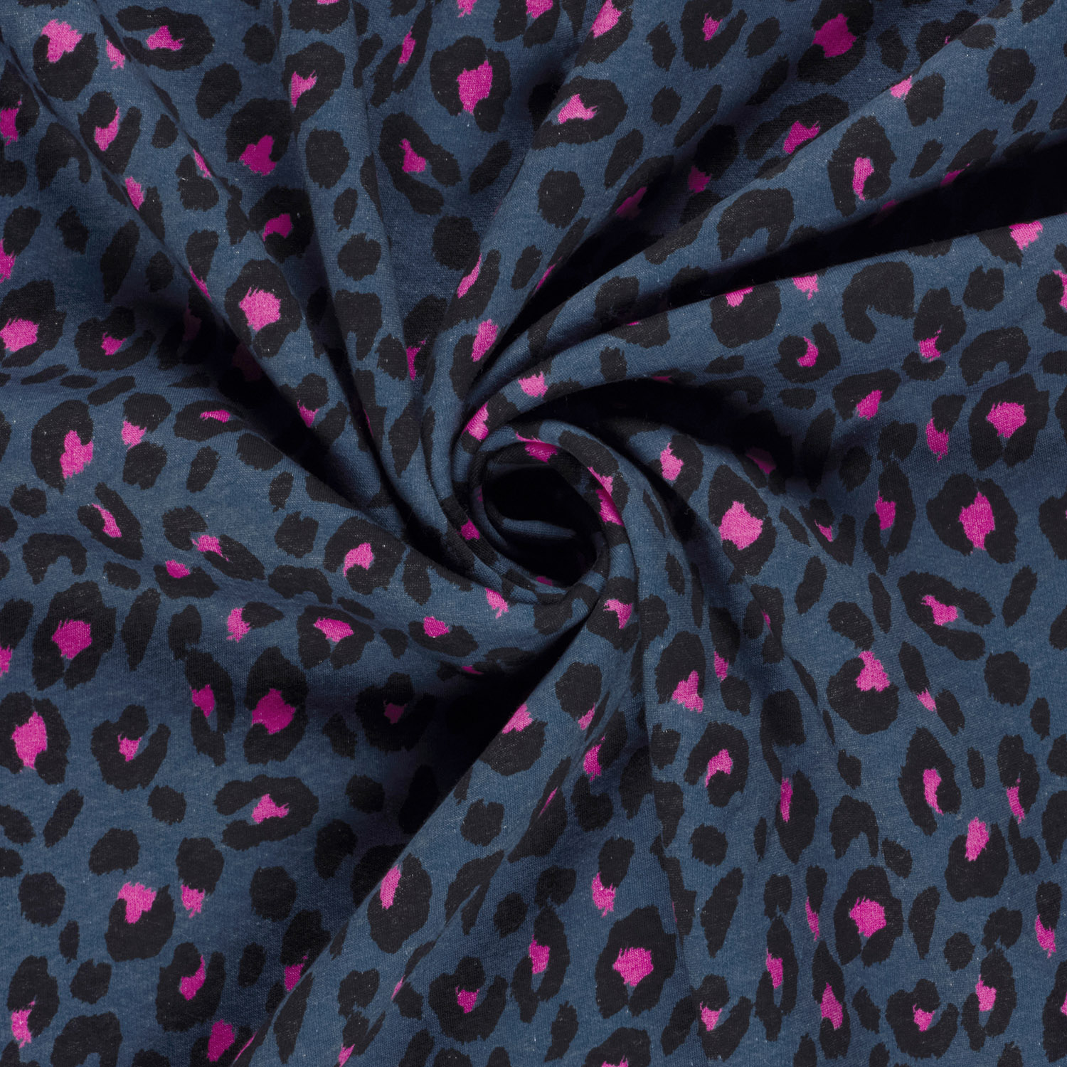 Een stof om verliefd op te worden: Deze wintersweat toont een expressief leo-patroon in diep marineblauw, doorweven met fijne, warme beigetinten en zachte, lichtere accenten. De digitale print laat de vlekken levendig lijken – als een modern, stijlvol dierenontwerp dat meteen in het oog springt.