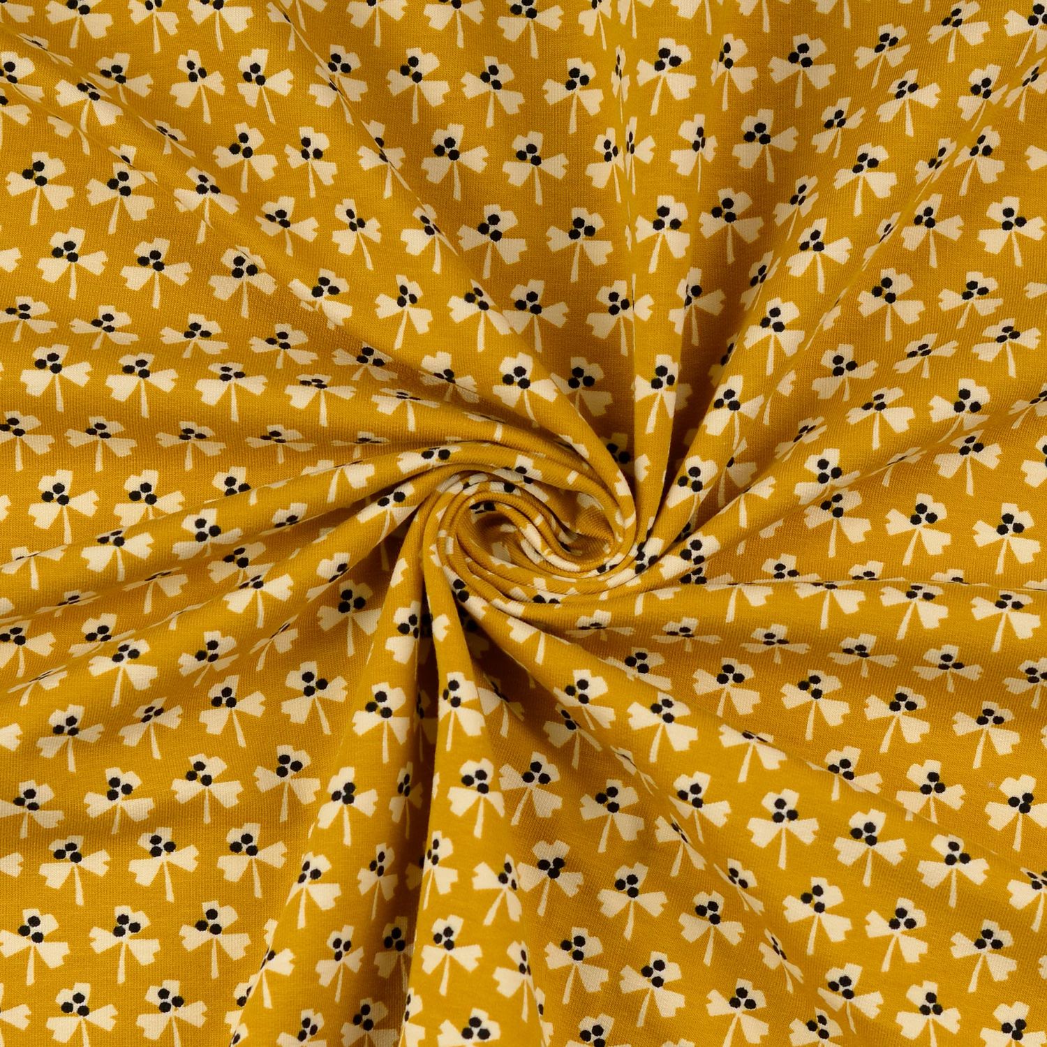 Een stof als een zonnige lentedag: op warm geel bloeit een speelse bloemenzee in harmonieuze natuurtinten. Fijne bloemen in wit, roze en bessen, fijne groene blaadjes en kleine accenten in bruin en oranje geven het ontwerp een levendige, maar toch rustige uitstraling.