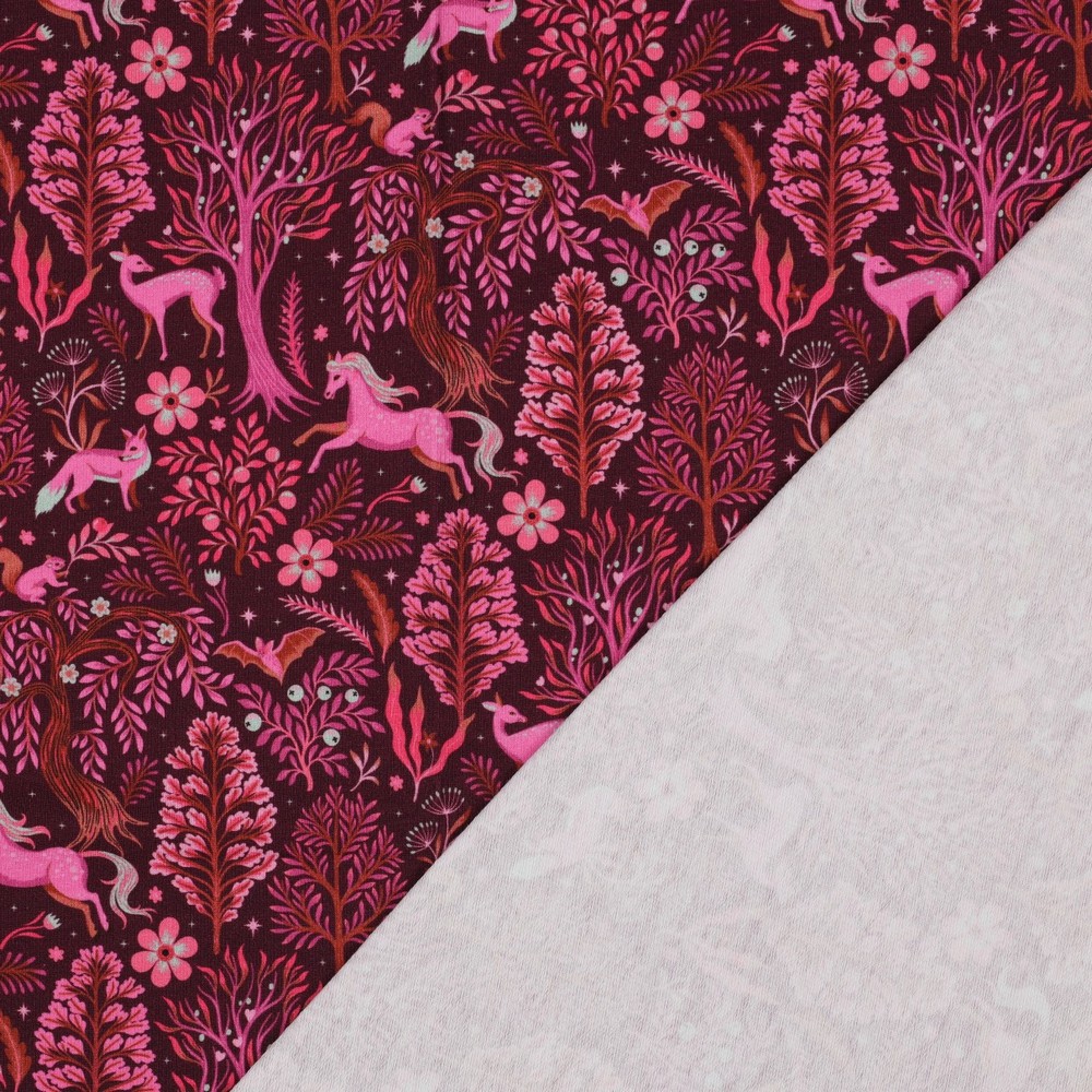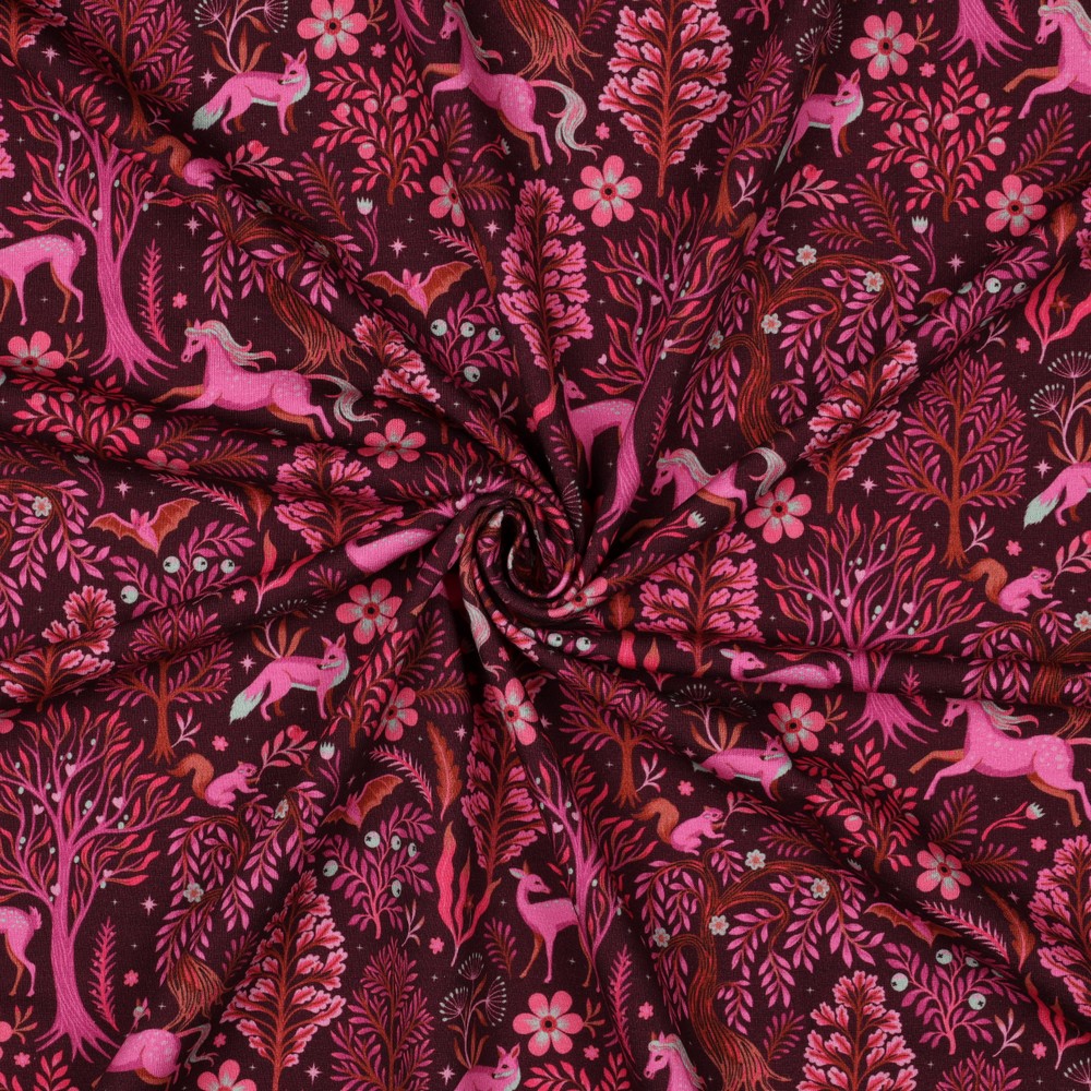 De hoogwaardige digitale print laat de kleuren schitterend uitkomen en laat elk detail tot leven komen – perfect voor favoriete herfst- en winterstukken die je het hele jaar wilt dragen. Of het nu gaat om knusse hoodies, sweaters, jurken, joggingbroeken, mutsen of kinderkleding: deze French Terry tovert in een handomdraai bijzondere comfortabele looks met een vleugje bosmagie.