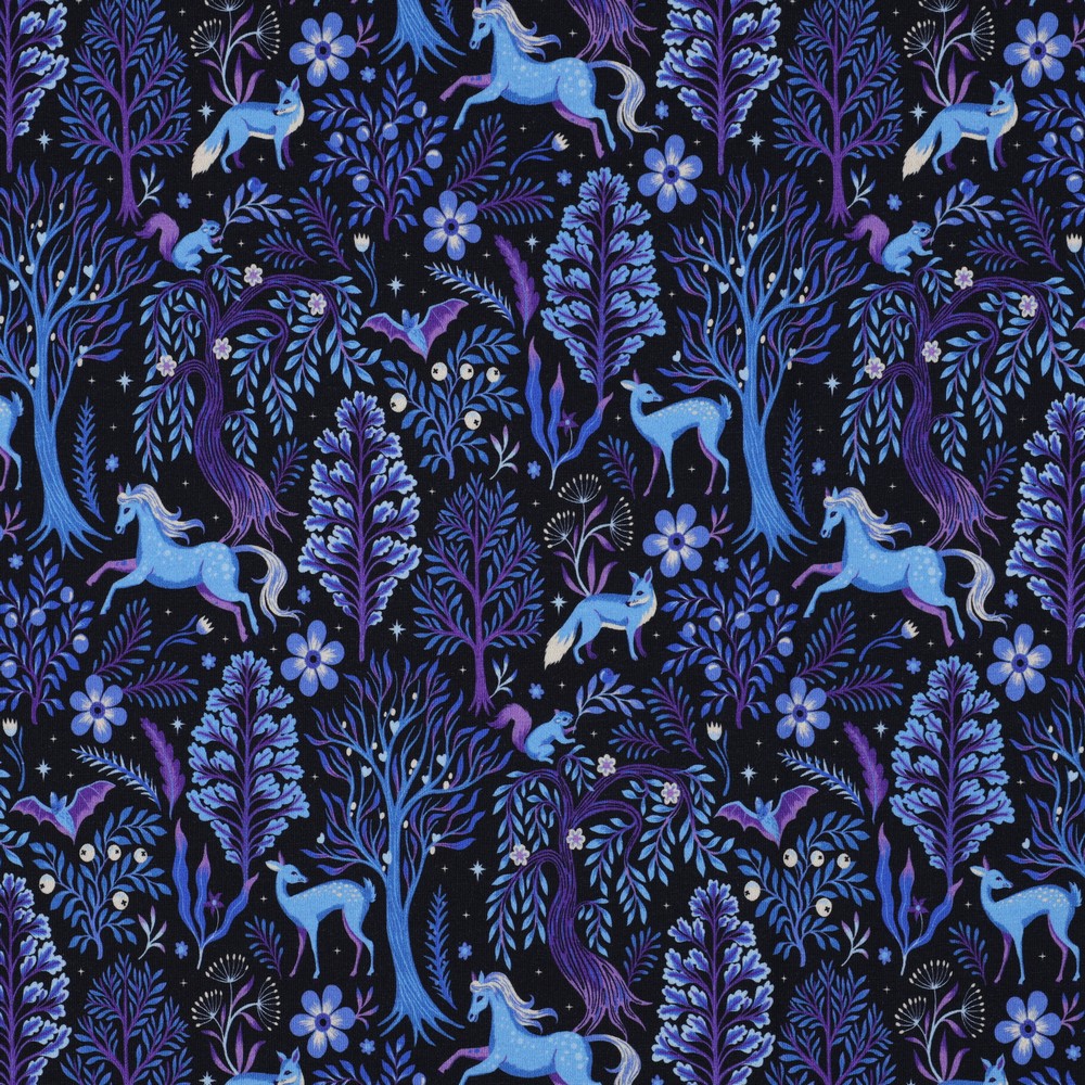 Een gezellige wandeling door het nachtelijke bos – direct op je nieuwe favoriete project: Op een diep navyblauwe achtergrond dartelen liefdevol geïllustreerde bosdieren tussen fijne bladeren en takken. Vossen, herten, uilen en andere bosbewoners zijn in warme natuurtinten en met fijne details uitgewerkt, waardoor het ontwerp levendig en toch harmonieus oogt.