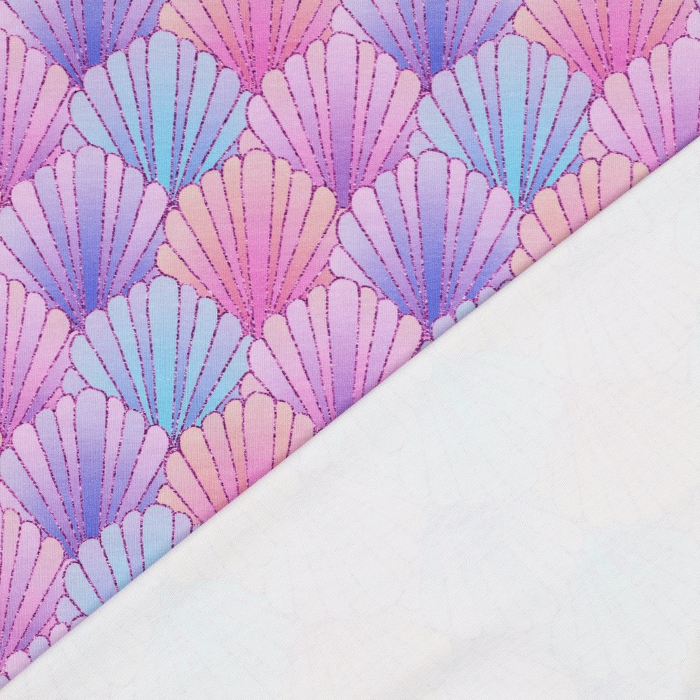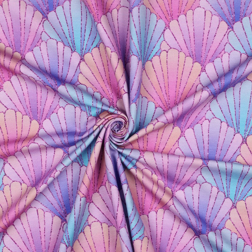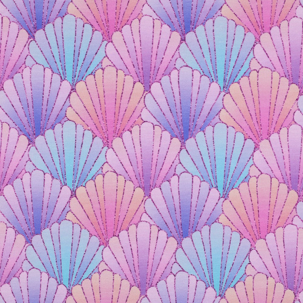 Of het nu is voor kleine zee-fans of voor je eigen maritieme favoriete look: met deze schelpen-French Terry in lavendel haal je het vakantiegevoel direct in je kledingkast.