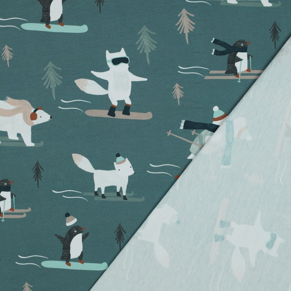 Zomersweat – French Terry digitale print skiënde dieren groen