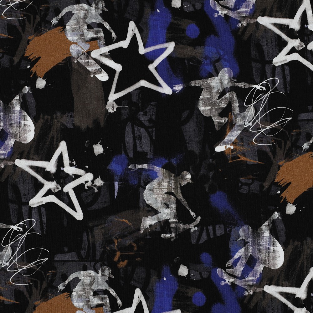 Deze zomersweatstof met graffiti-board-motief brengt beweging en streetstyle in je naaiwerk.
