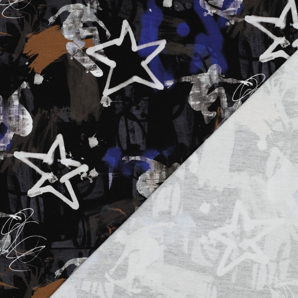 Naam: Zomersweatstof - French Terry digitale print Graffiti Board blauw